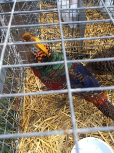 Some sort of pheasant. Looks like someone got a new box of 64 crayons and went to town. There were peacocks and parakeets, bunnies on a date and a goat on a leash. We bought four bales of straw, an axe, ten crates, two heated chicken waterers, and 26 planks of cedar.
