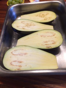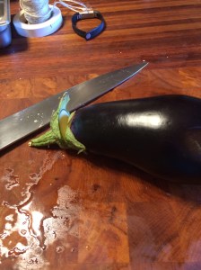 And I mean liberally. Wait a while and wipe down with a paper towel. Repeat a couple times while you preheat the oven. I go at 350 because it works and I’m lazy. Crosscut the eggplant.
