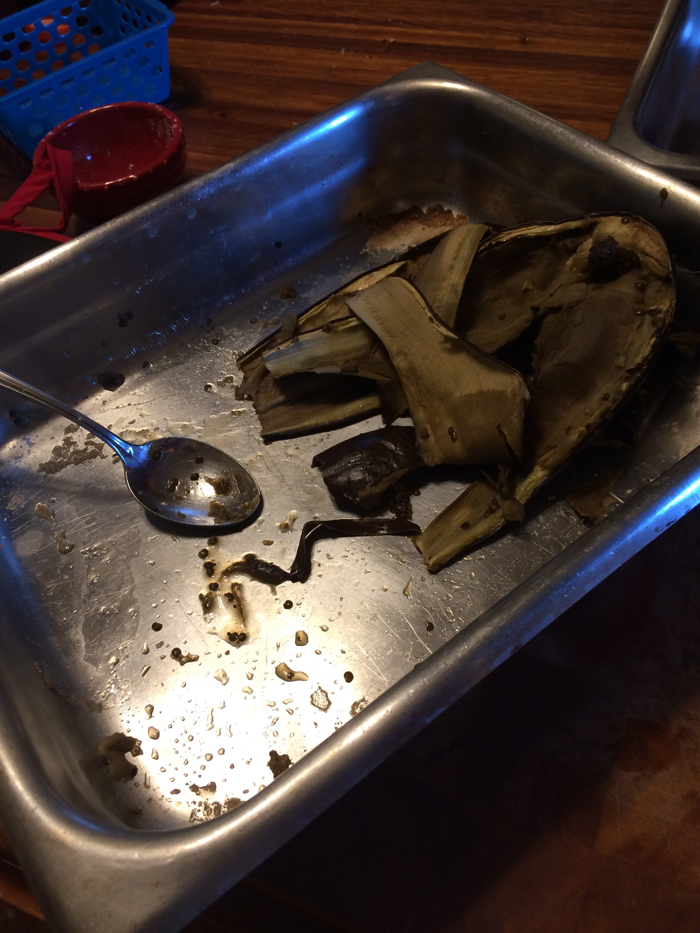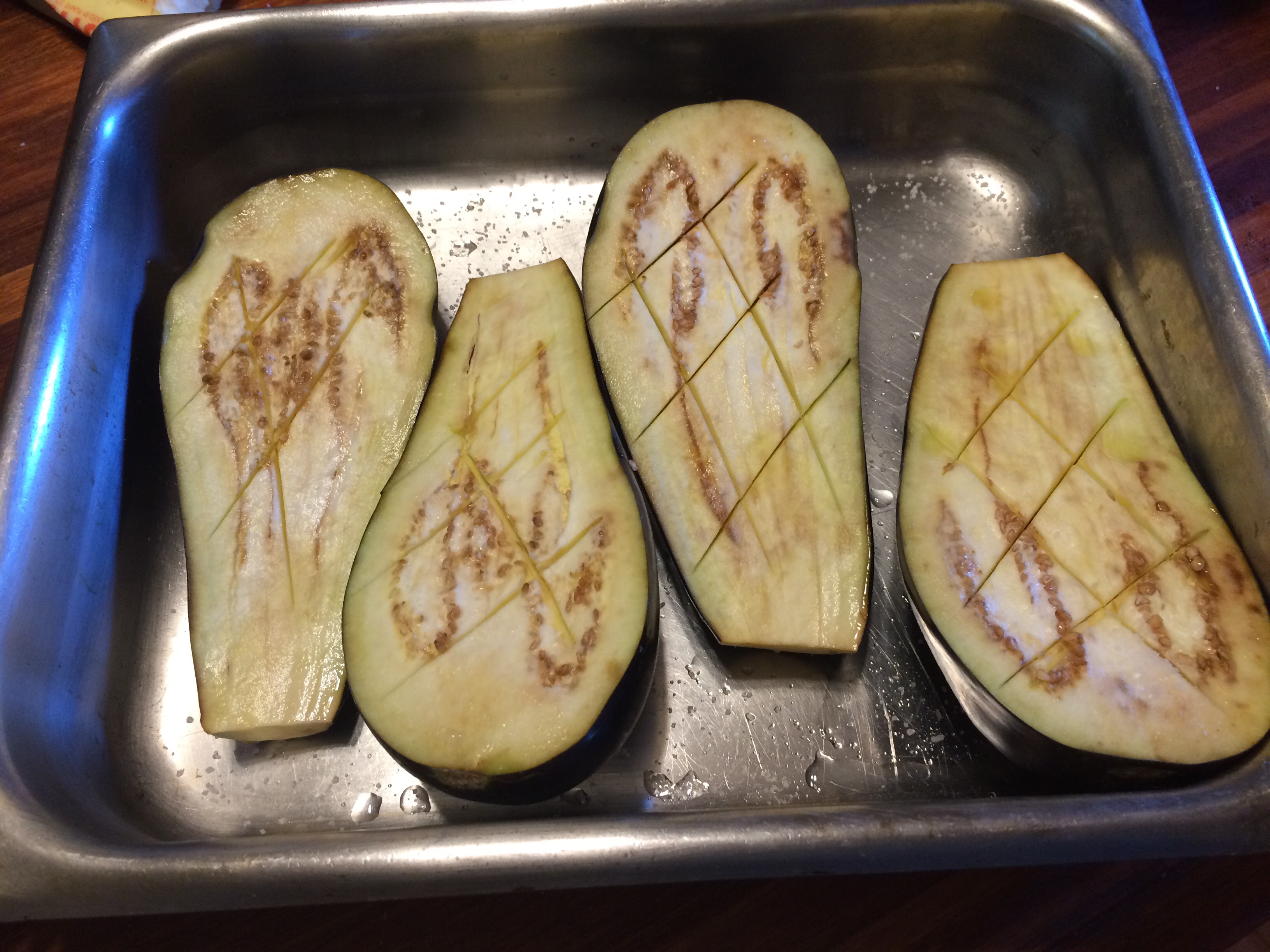 In our house, one of the husband’s favorite things is babaganoush. So I made some yesterday, we got some lovely eggplant at the farmers market.