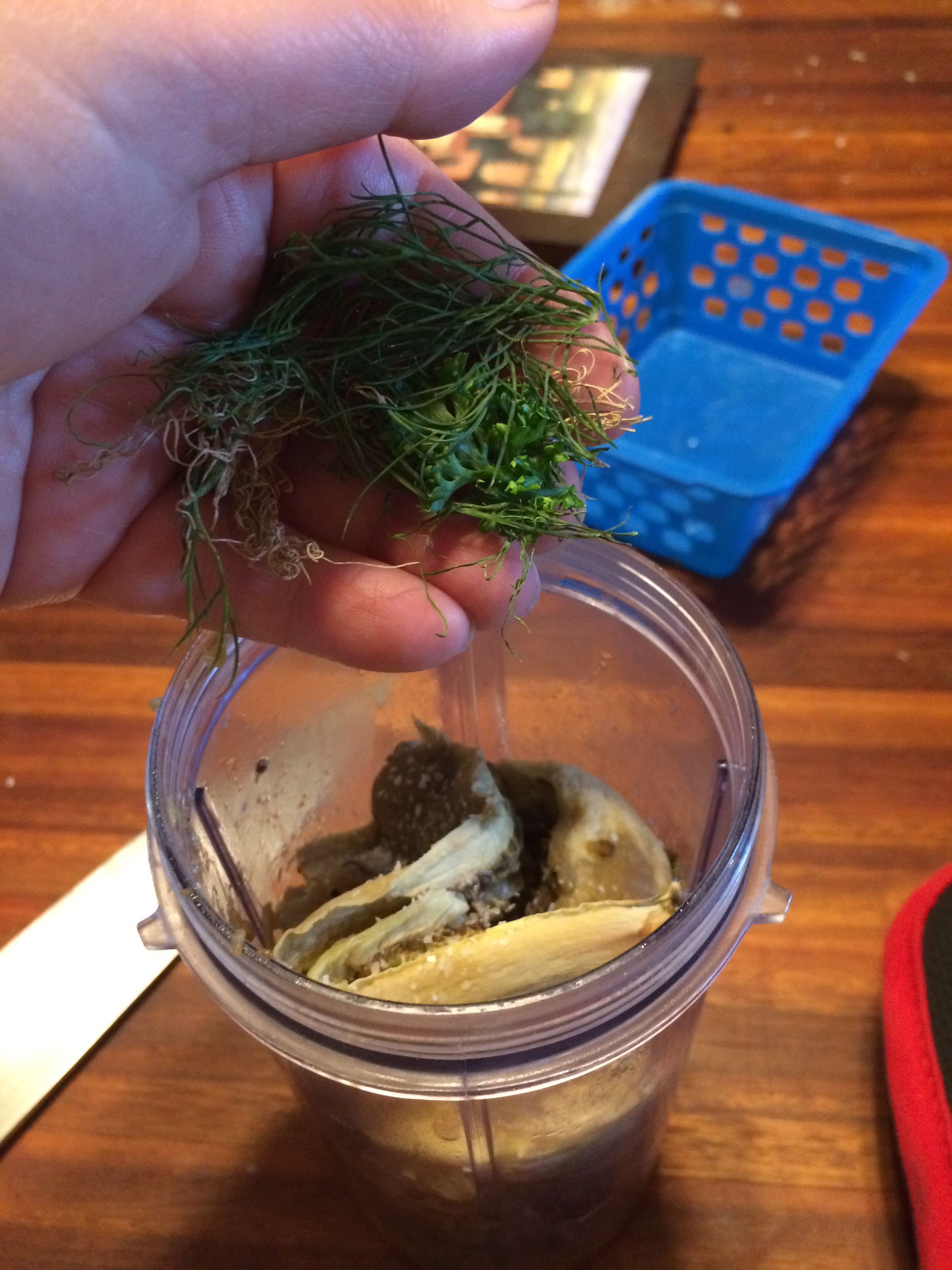 Juice a lemon (or if you have it, add preserved lemons), salt, roasted garlic, and fresh dill and parsley. Scoop out the innards and add. This time use the magic bullet.