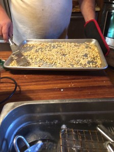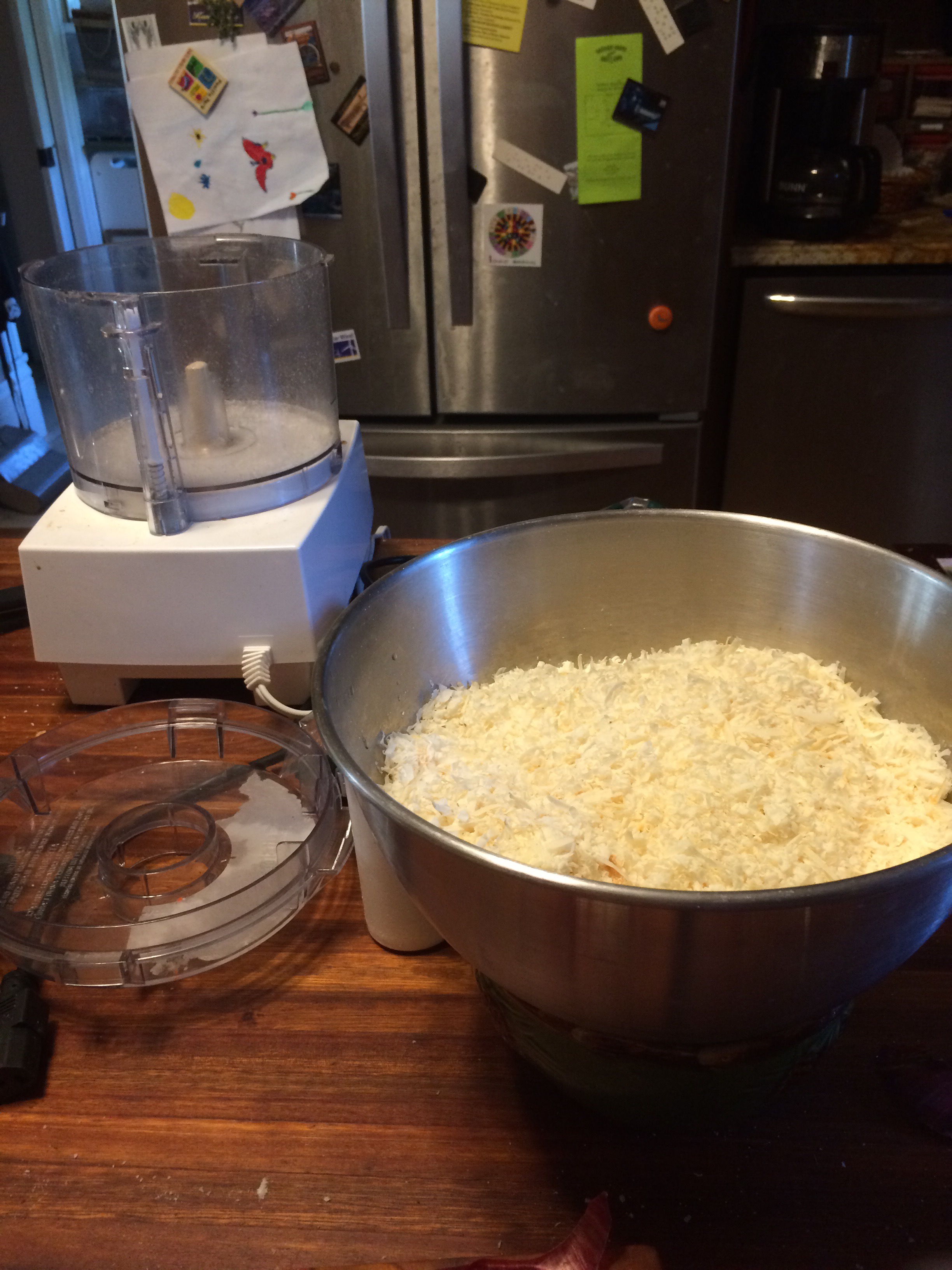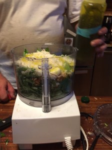 First he toasted the pine nuts. And shredded the cheese. Then came the garlic.
