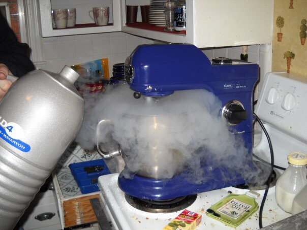 Let me back up. The husband had a really well-paying job, and few expenses before he went to grad school. So he has a lot of great kitcheny stuff, including this monster Viking mixer – seen here on an early date when he impressed me with liquid nitrogen ice cream.