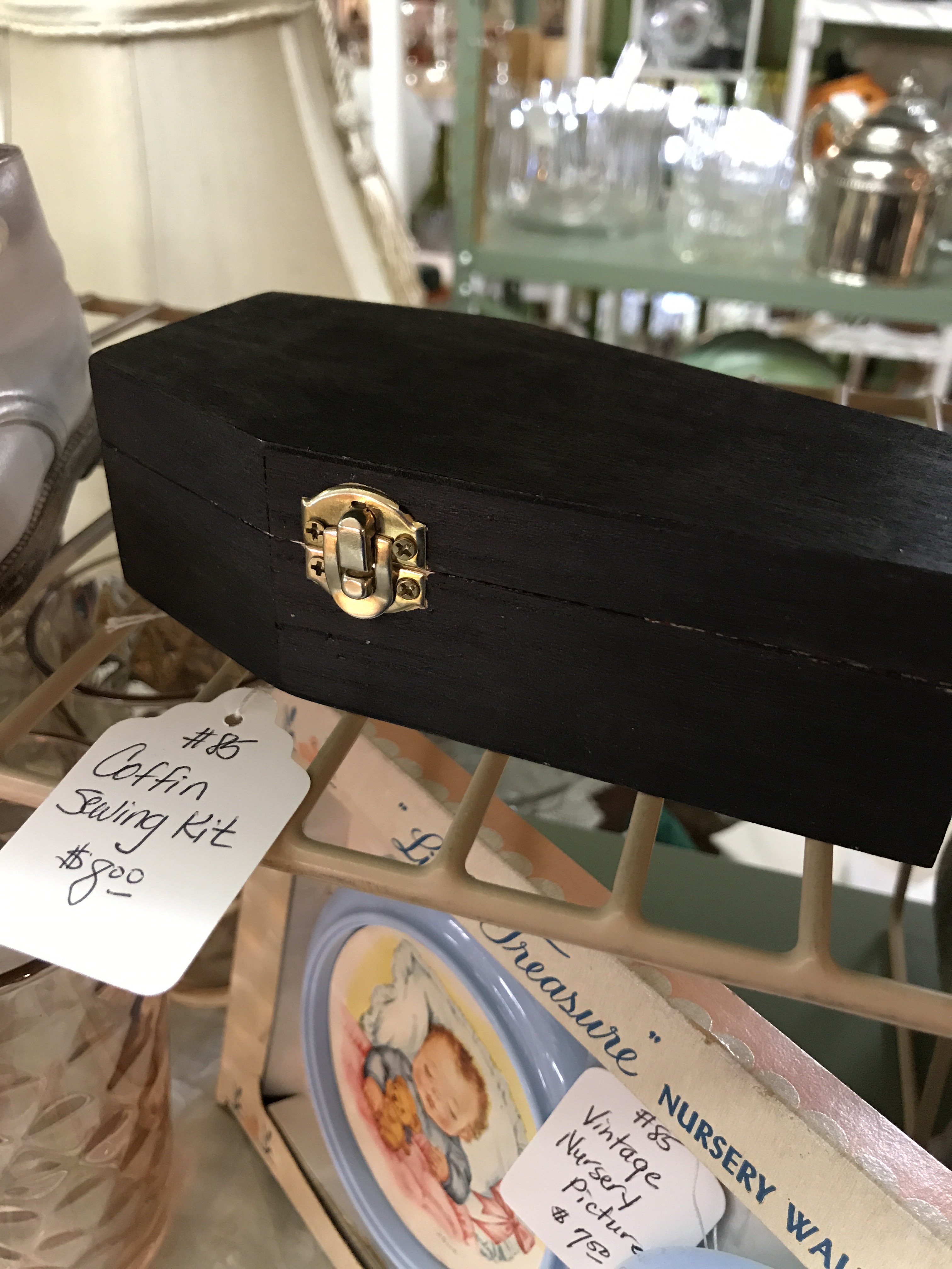 We ended up in a junk shop that looked vaguely familiar. Possibly because we were there like two weeks ago. We’re smart. But we found a thing or two, and headed back to the farm. Of note, but not purchased, was the coffin sewing kit, for the crafty goth.