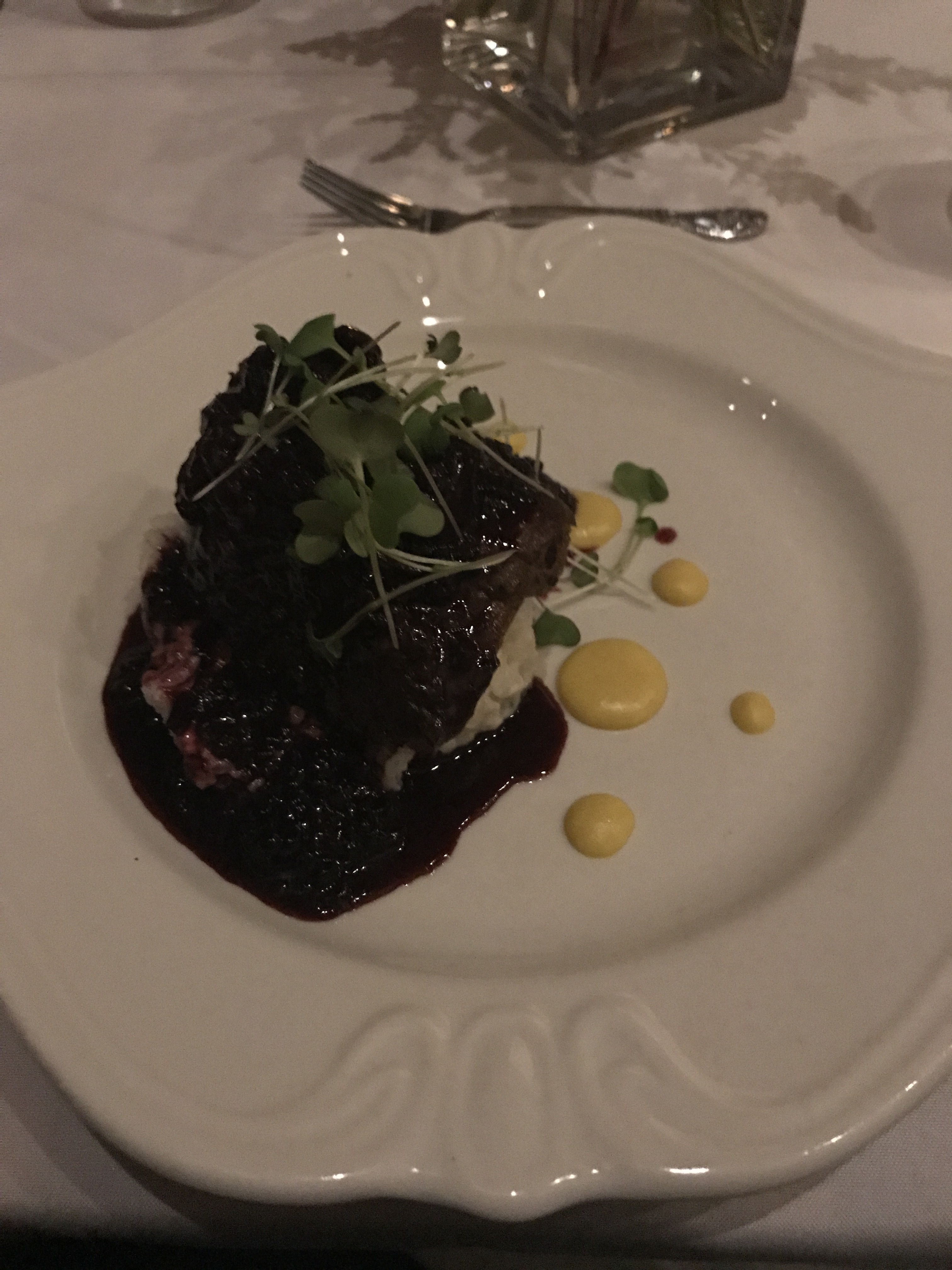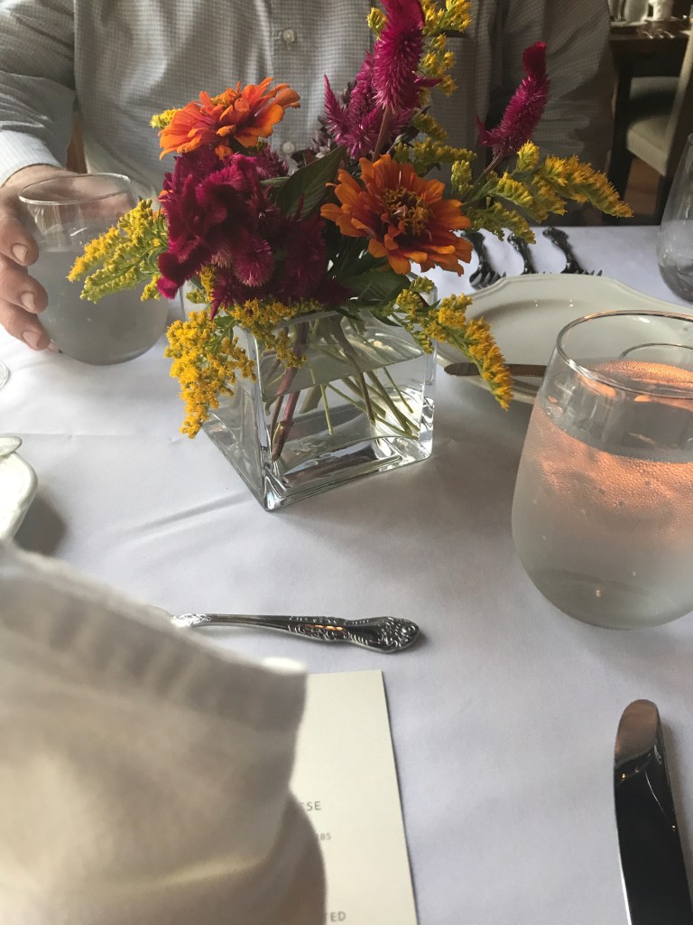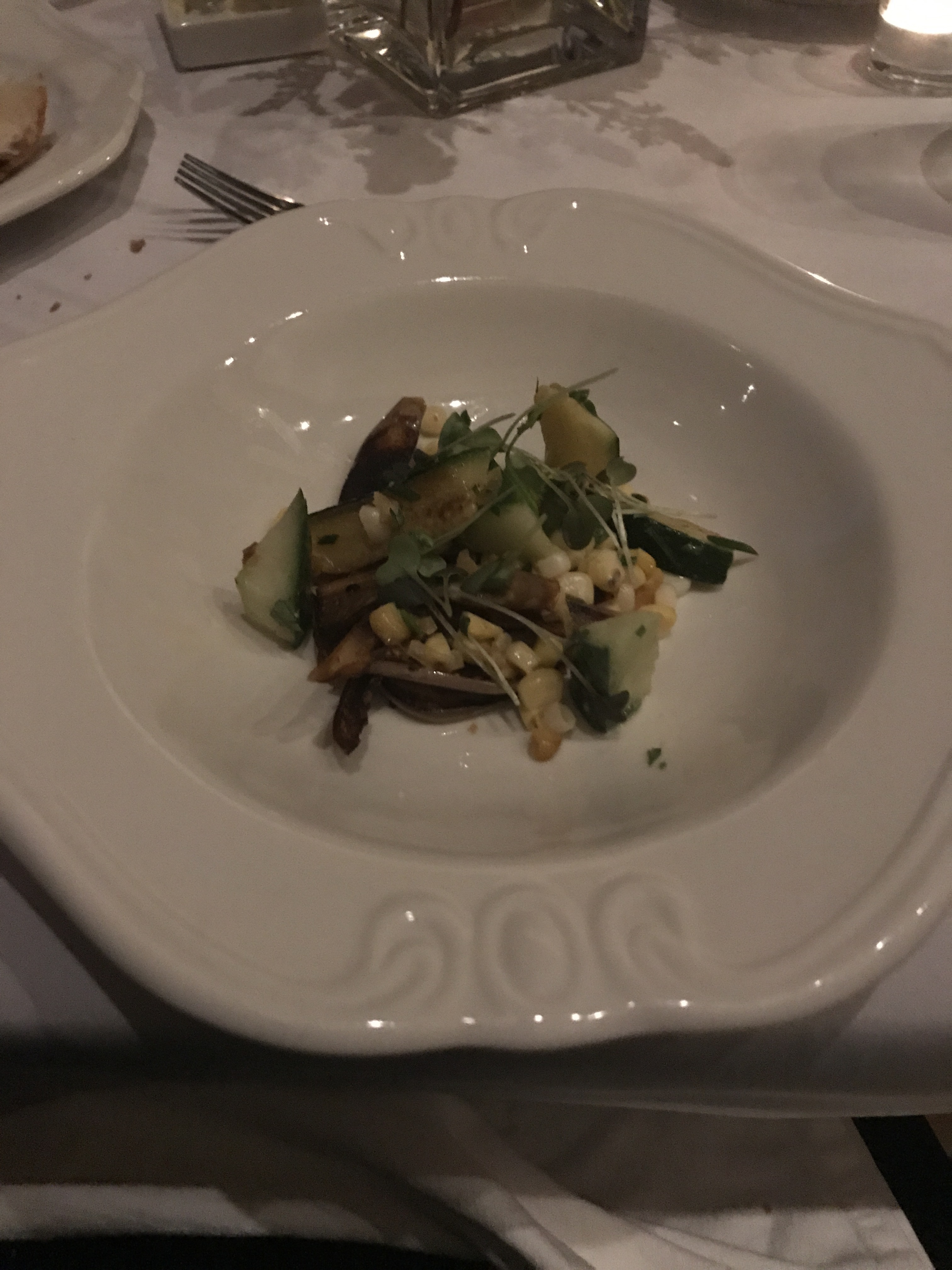 We moved inside and has a luscious carrot ginger purée with Garlic scrapes at our lovely table.
