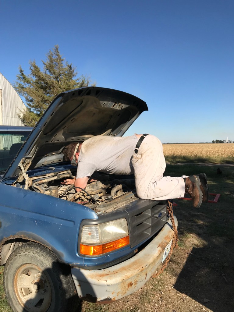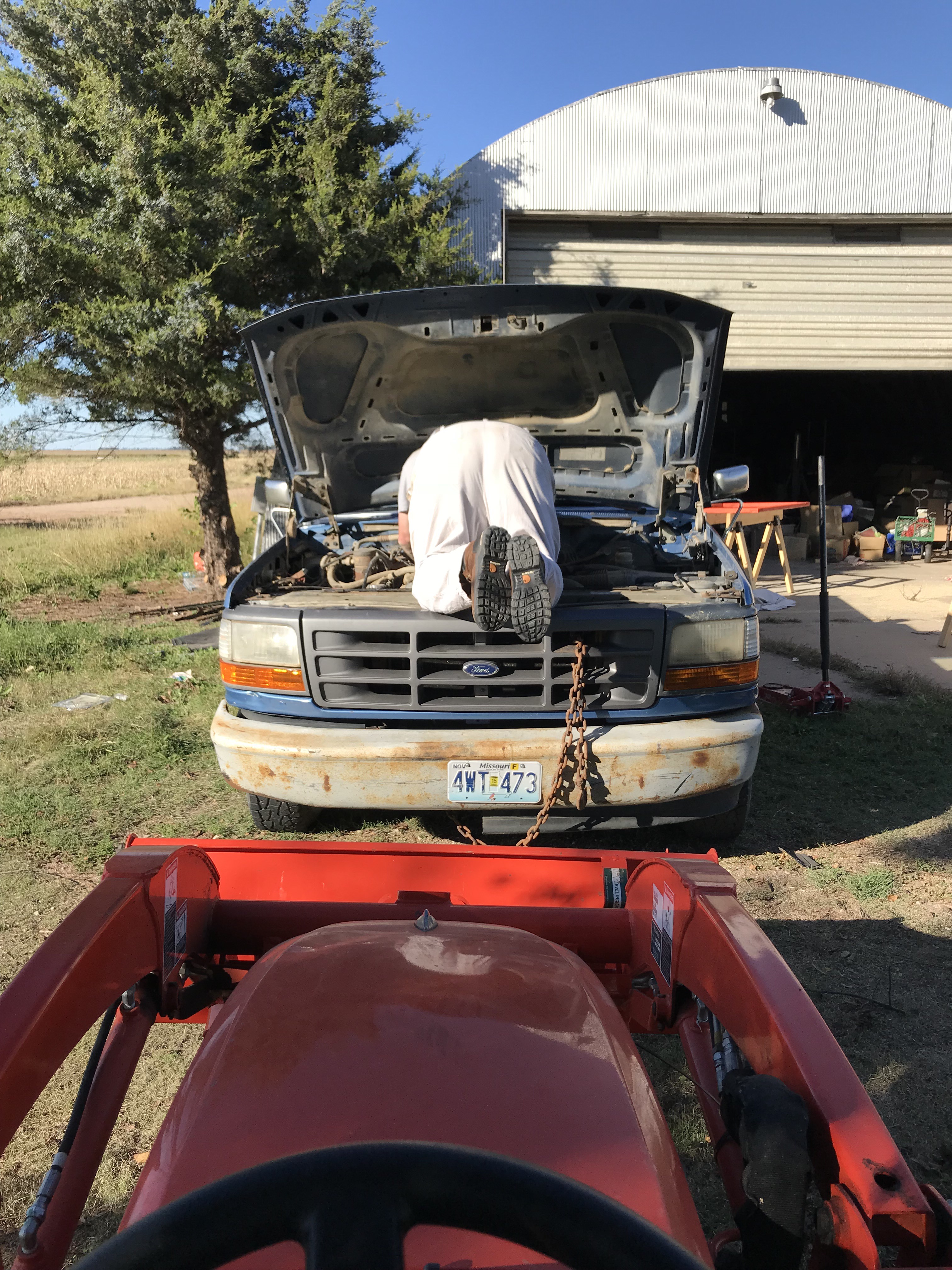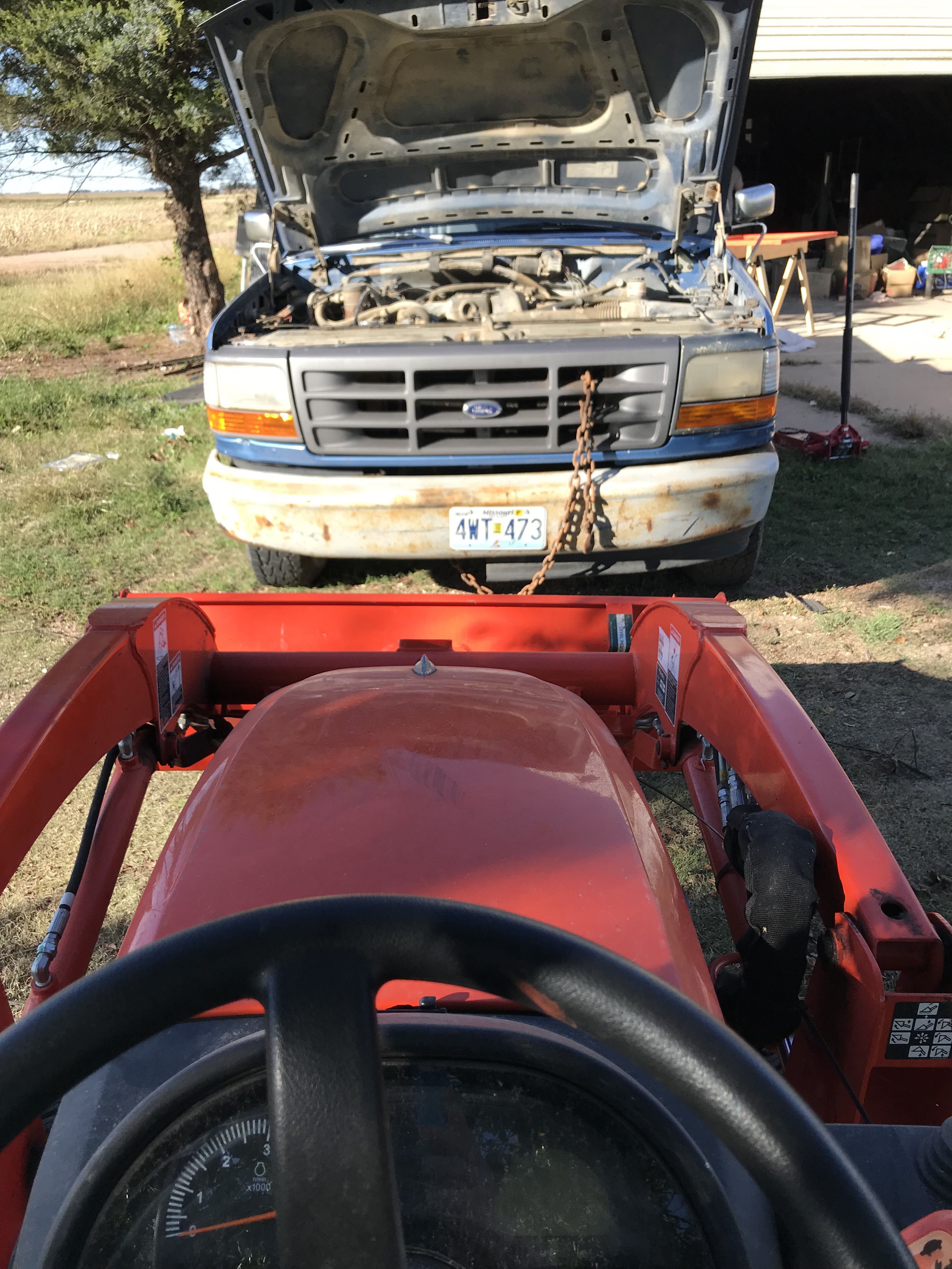 Today I used the tractor to help my beloved move the immobile truck. I pulled it out of its parking spot, and pushed it until it was on concrete.