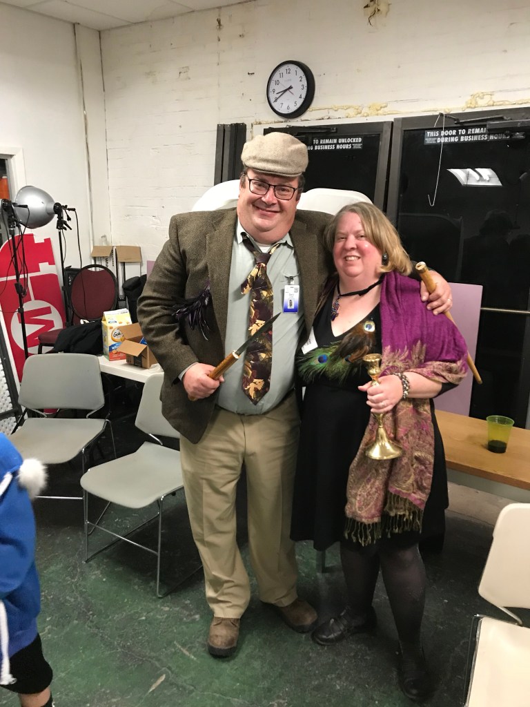 So I hit up my local craft store, and started buying notions – feathers, flowers, stuff like that. Bought the husband a tweed jacket and some patches to put on there. I’ll just wear a black dress, and casually carry a candlestick in my purse.