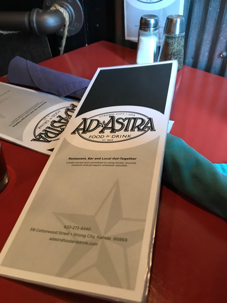 Awesomely, as we were driving along we saw four eagles – one adult and three juveniles. We couldn’t find anything great in Marion for lunch on a Sunday, so we wandered back to Strong City, for lunch at Ad Astra, a strangely awesome restaurant in a tiny little town. It caters to cyclists, and is famous for its Brussel Sprouts. Which are amazing.