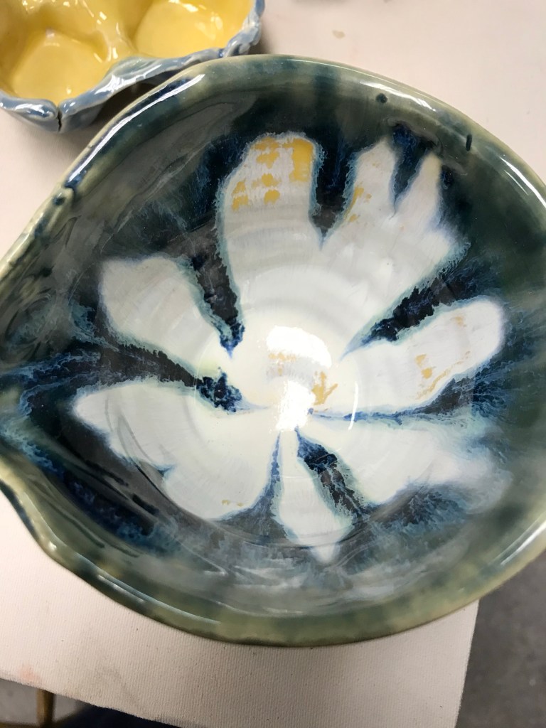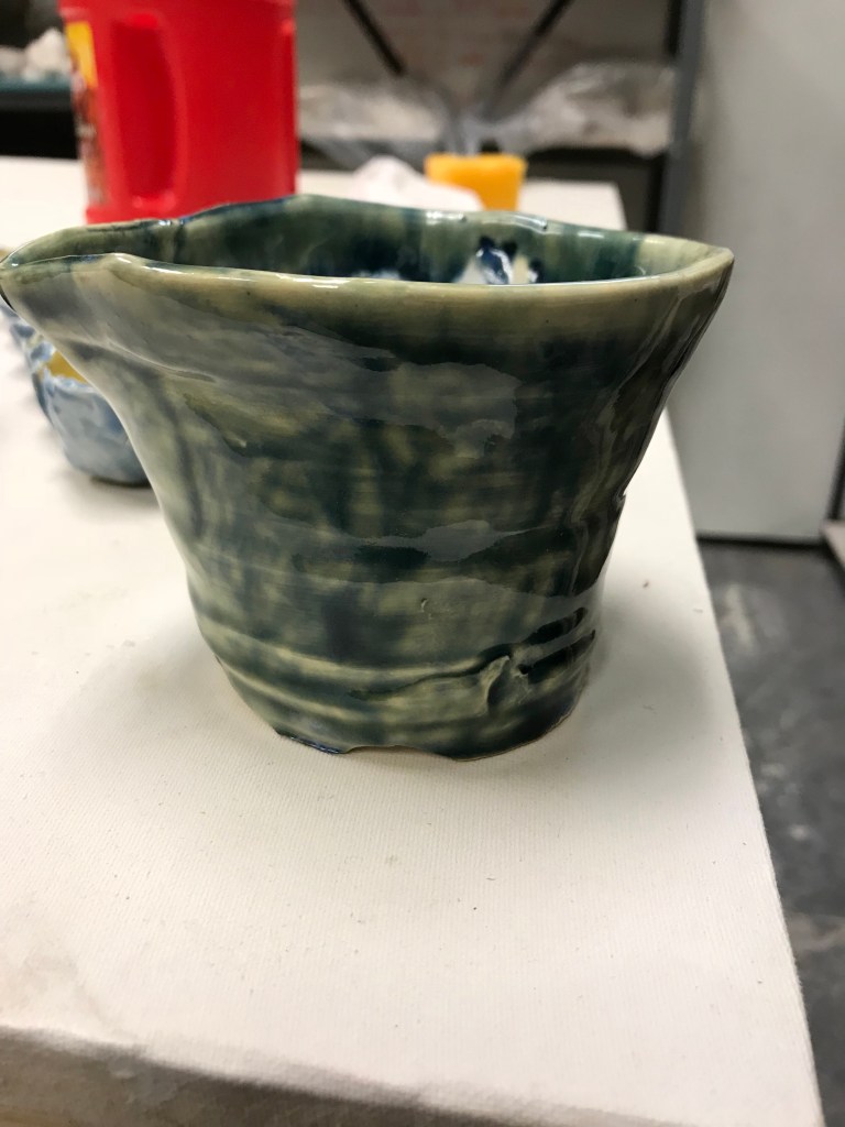 A bowl and a pitcher. The bowl is going to be a gift, and possibly the pitcher. These are both thrown pots, The pitcher got a little iffy in that one spot, so I pinched it out to make a spout. It was painted with a cream glaze, with a blue glaze over it, and dripped down in the middle. the bowl was just two blues that meet on the rim.