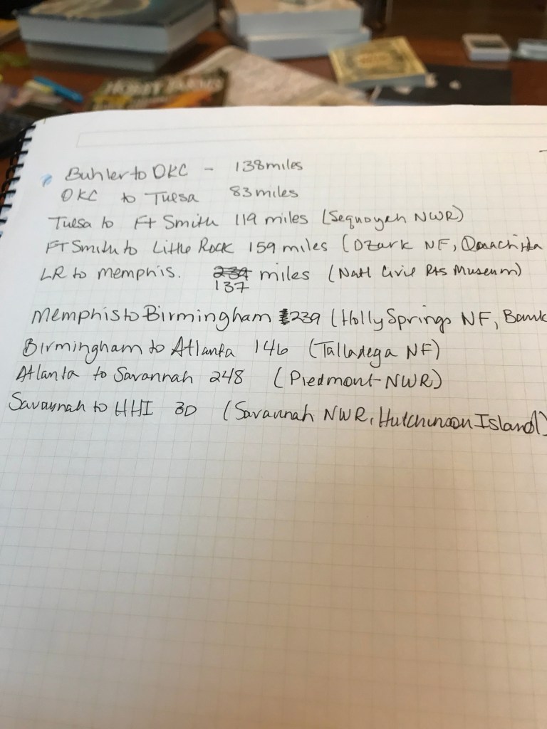 I still have a course in mind, but instead of turn by turn instructions, I have waypoints. I have an idea of where we need to be past by the end of Saturday and Sunday. I’ve listed every National Park, Forest, and Wildlife Refuge anywhere near our route, in case we want some outside time. And I’ve given us three days to get where we need to go. And I’m letting go of “where are we going to stay.” We have internets, money, and god help me, camping gear.