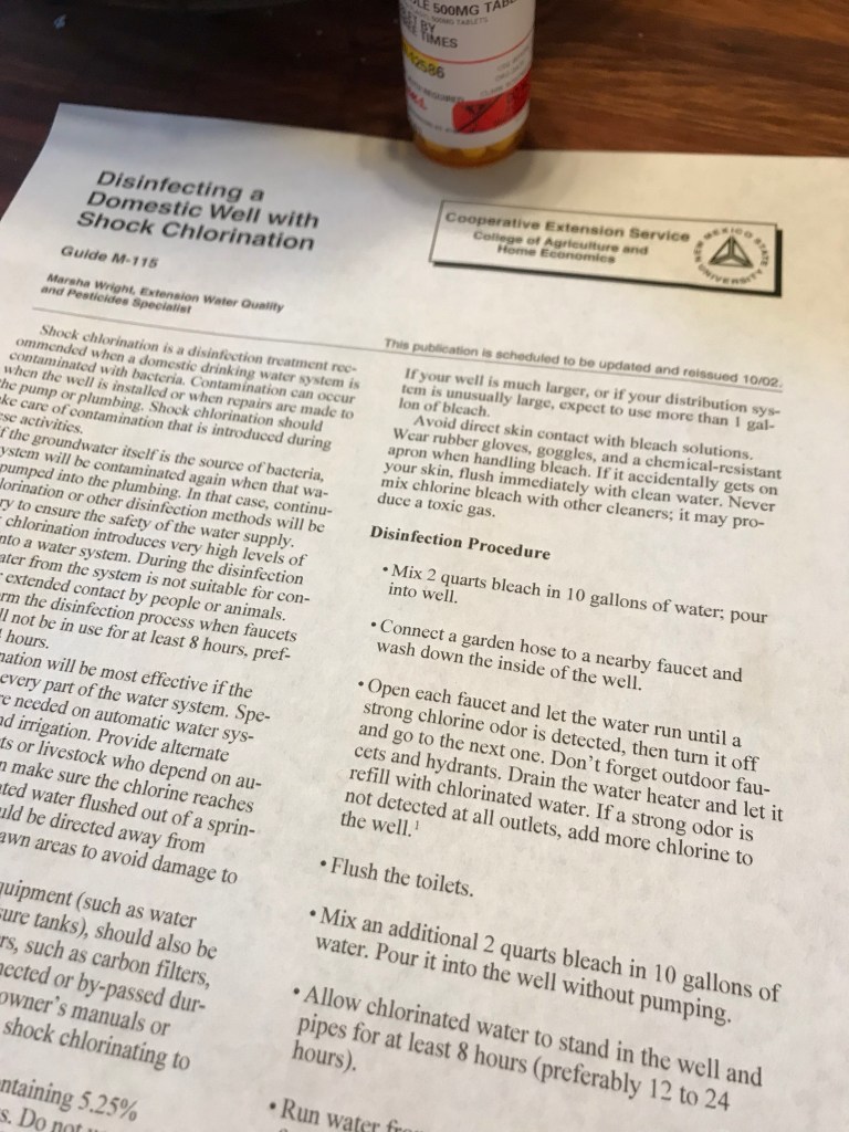 We decided to shock the well, so I’d stop puking my guts out. We get everything ready, have a place to stay for the 24 hours that it will sit. Go to Lowe’s when we find out that we’re missing parts on the seal.
