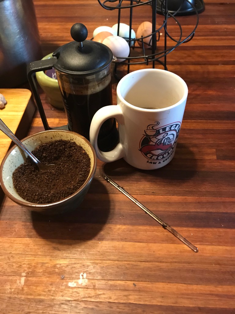 The coffee cup is from a coffee shop/law office that used to be located down the street from my sister in Dallas. It still makes me giggle.