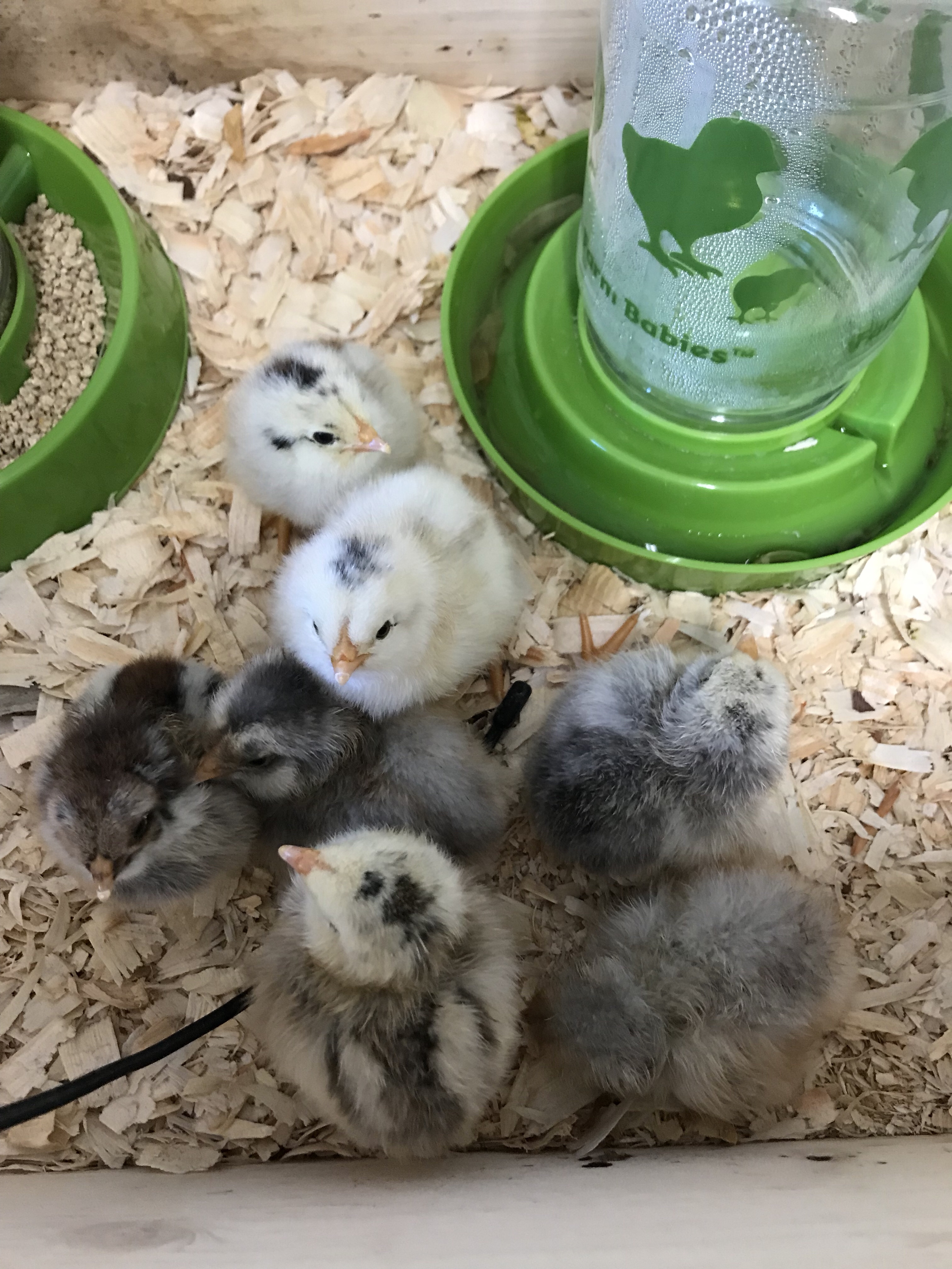 We had a brooder ready to take the chicks. It was actually one of the brooders we built for the bees, but the measurements were a skosh off, so we repurposed it as a chicken brooder.