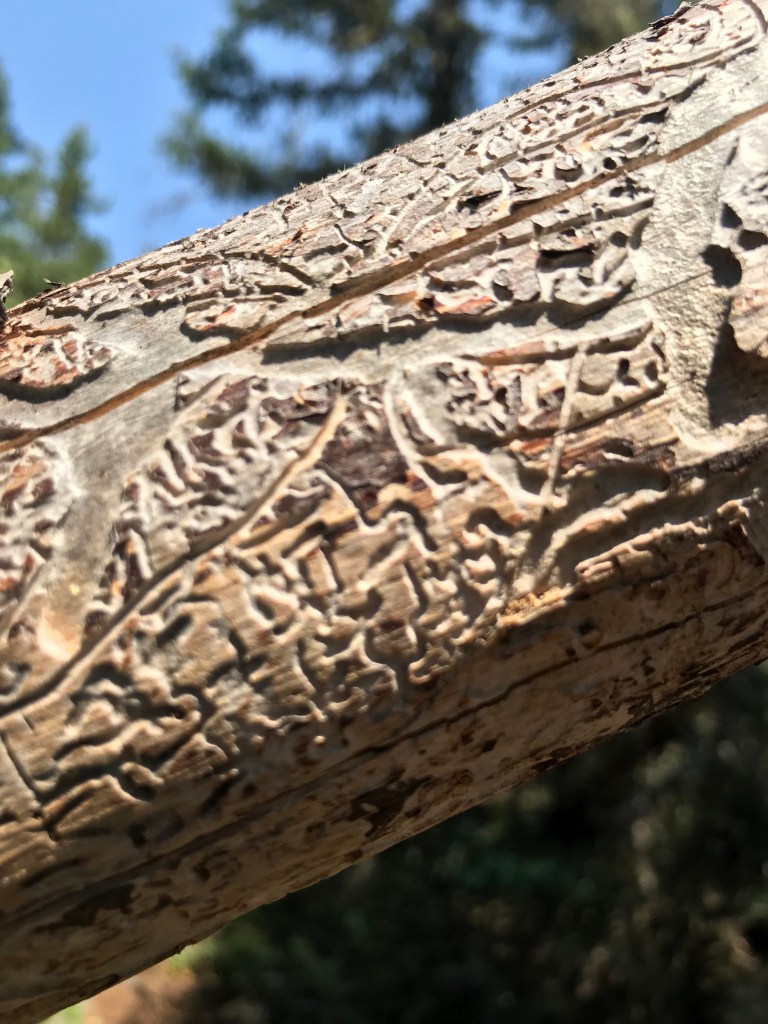 Flowers and trees. I love the old deadfall with their intricate details from, I presume, insects. It looks like ancient hieroglyphs with mystical meanings.