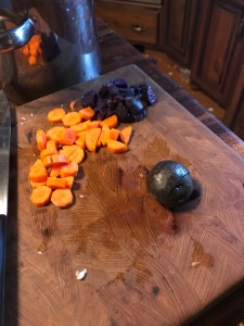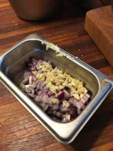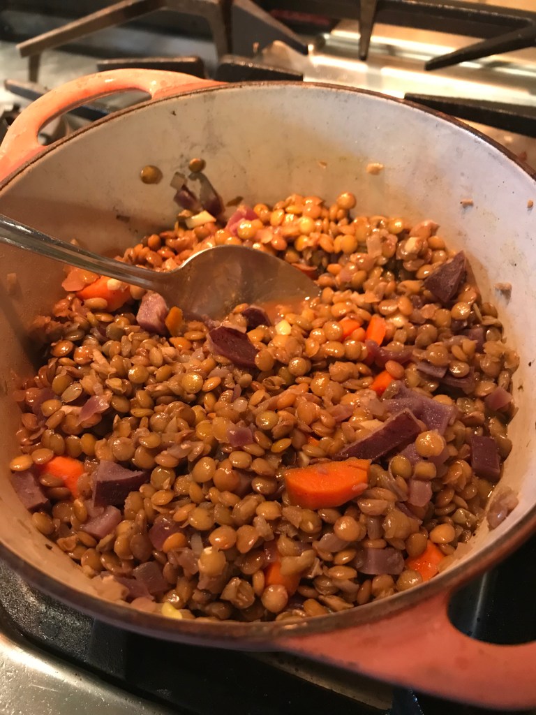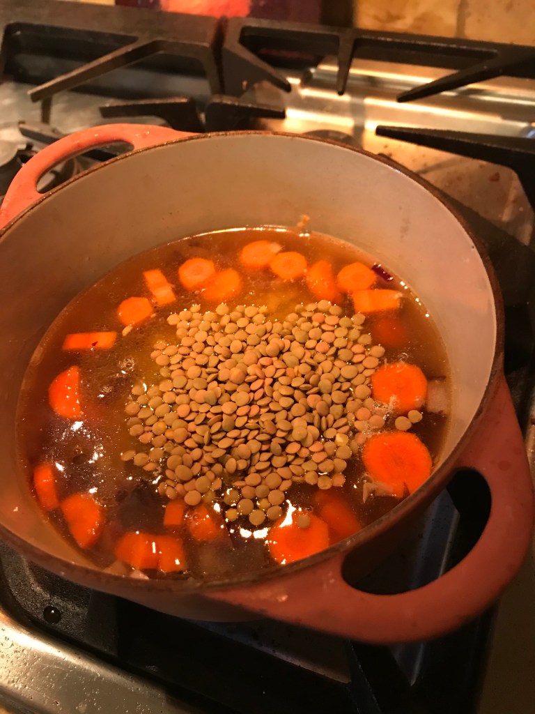 Start with your veggies: onions, garlic, carrots, and potatoes. Cut into small bits. Saute the onions and garlic until soft, then add the carrots and potatoes. Get a bit of color on them, then add chicken stock and lentils.