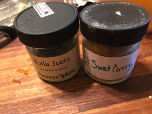 Spice it up – I went with sweet curry, kala jeera, salt, pepper, and chile powder, but you can put in whatever you want. I like hot and sweet, so it worked for me. For my acid, I put in white wine vinegar, but that didn’t give me the punch I wanted, so I also added apple cider vinegar.