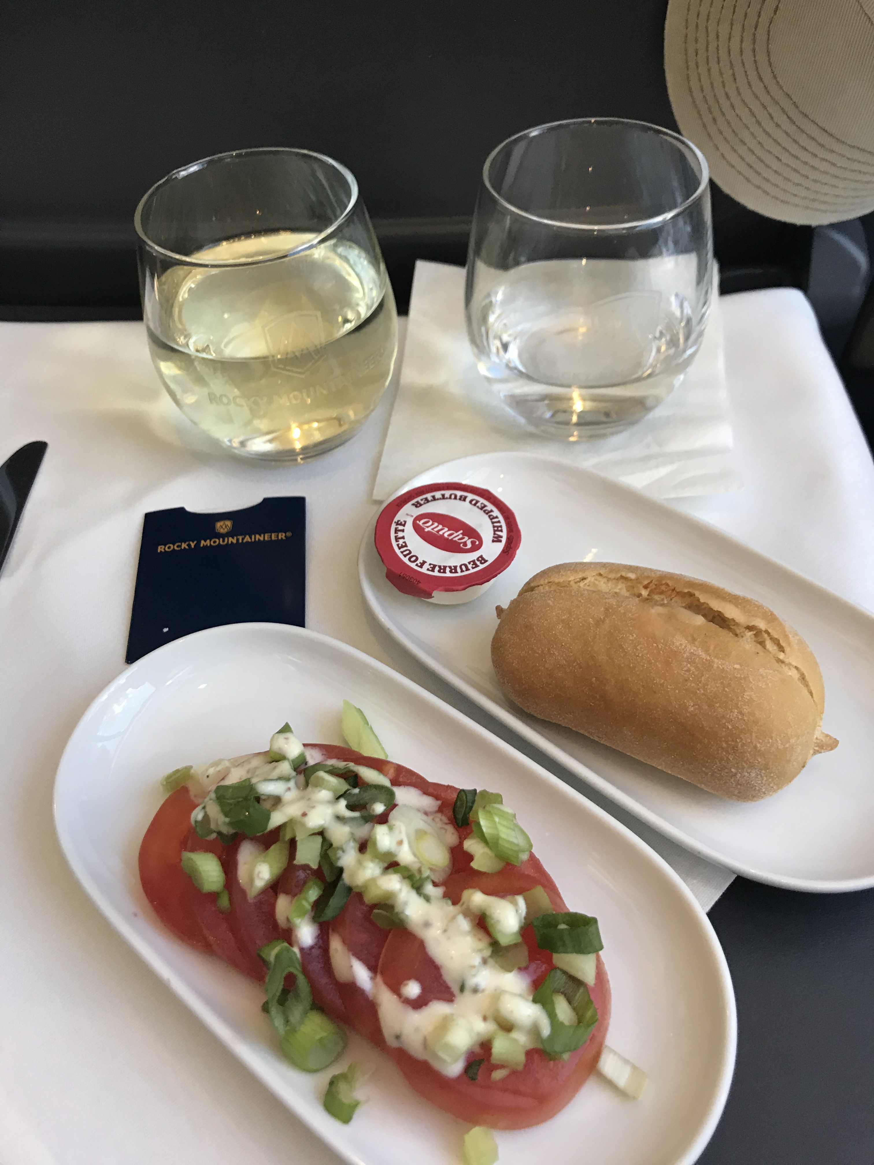 Get on the train at 7-ish. We start with a toast. Then coffee. Then first course of breakfast. Second breakfast. Coffee top-off. And then the bar opens.