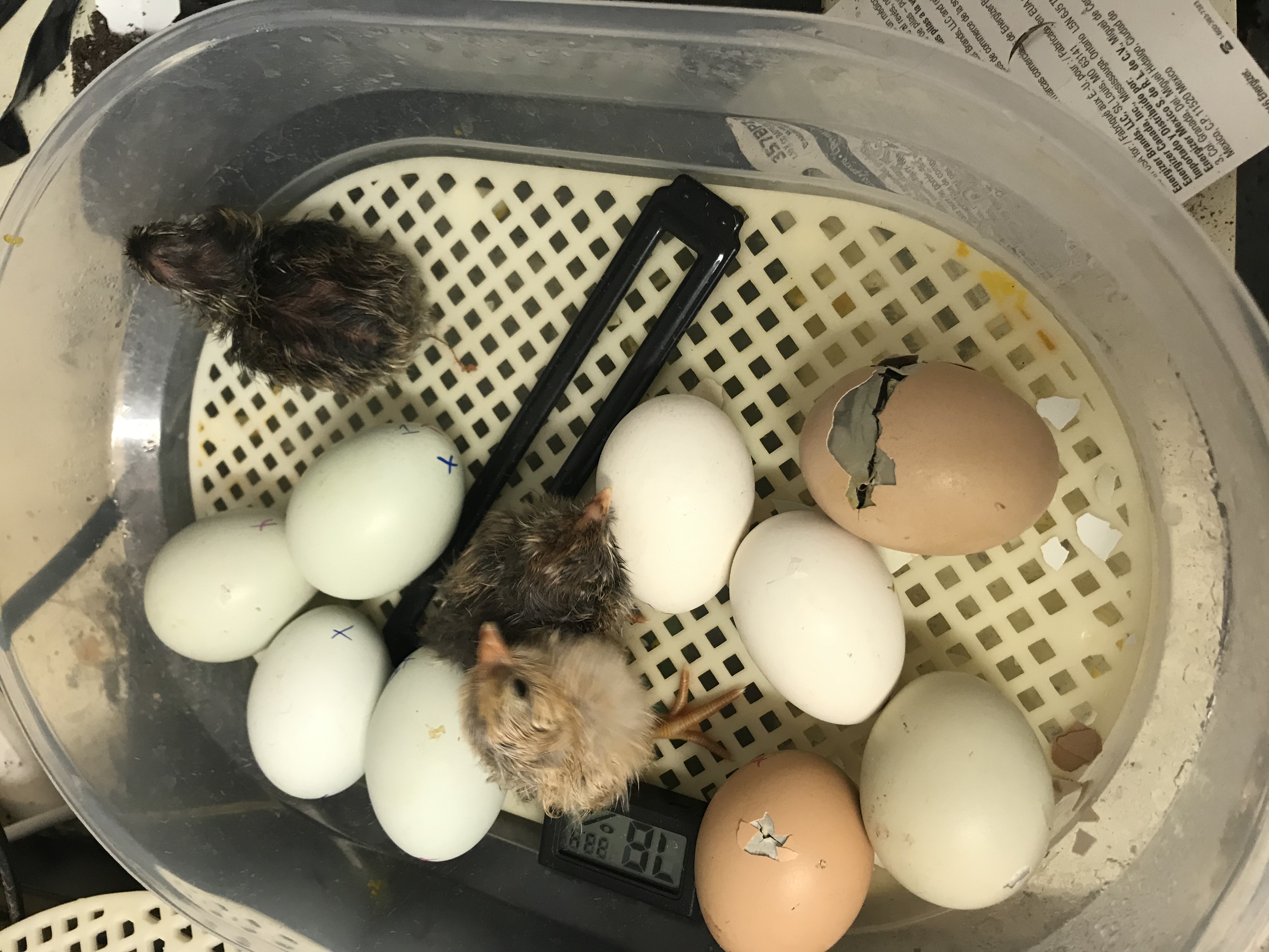 But we had one more surprise – a leghorn egg hatched on day two. And another one pipped! Alas, it was just a broken egg.