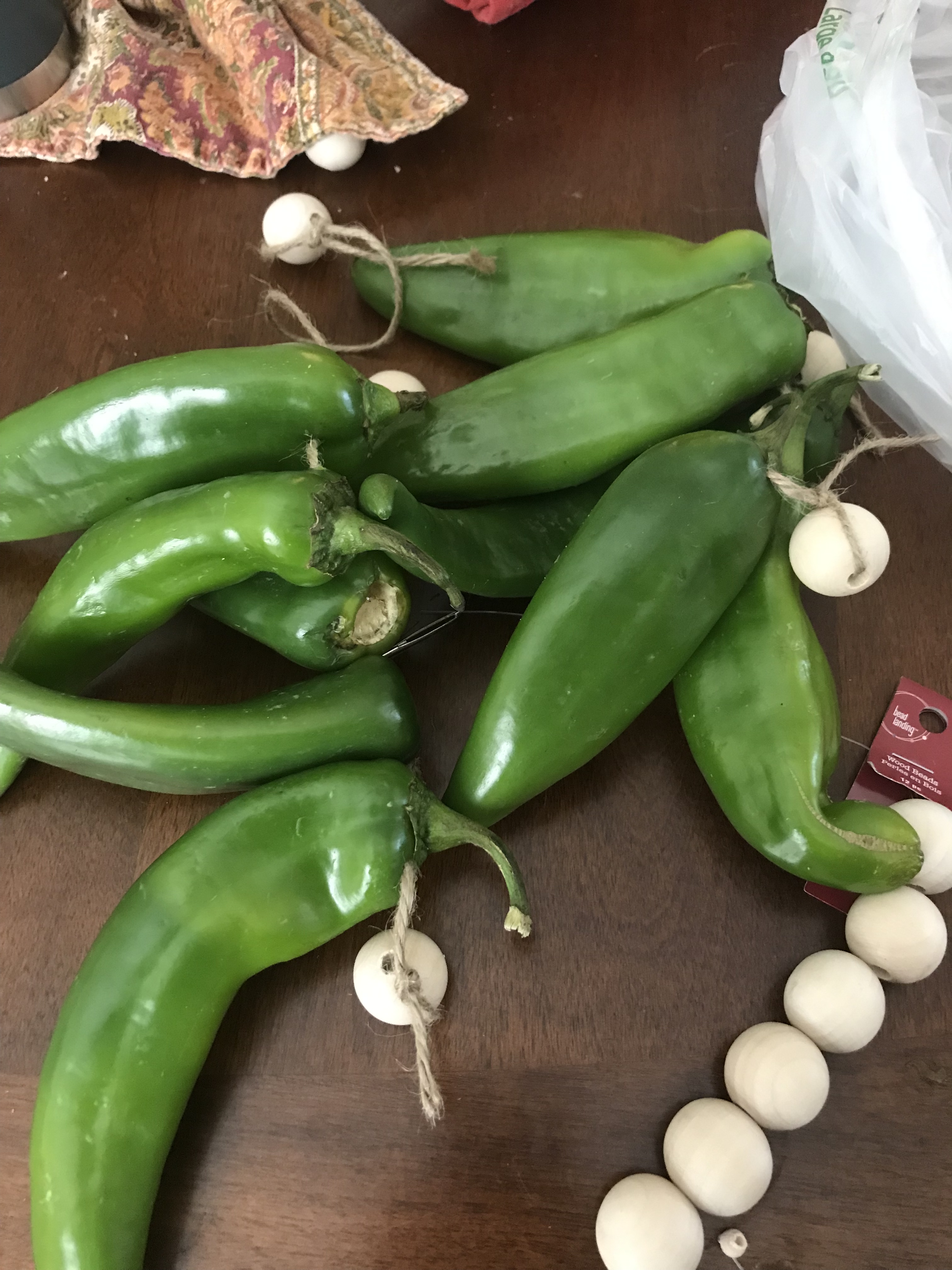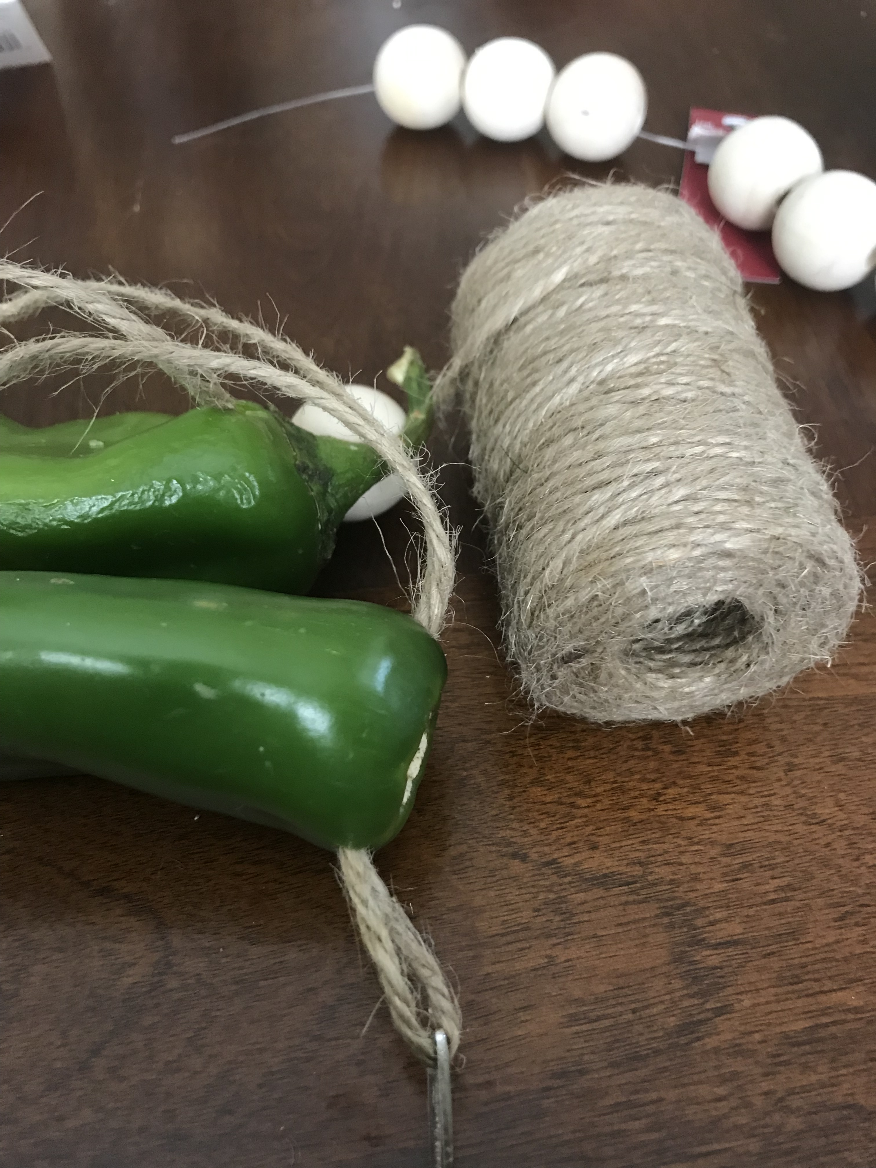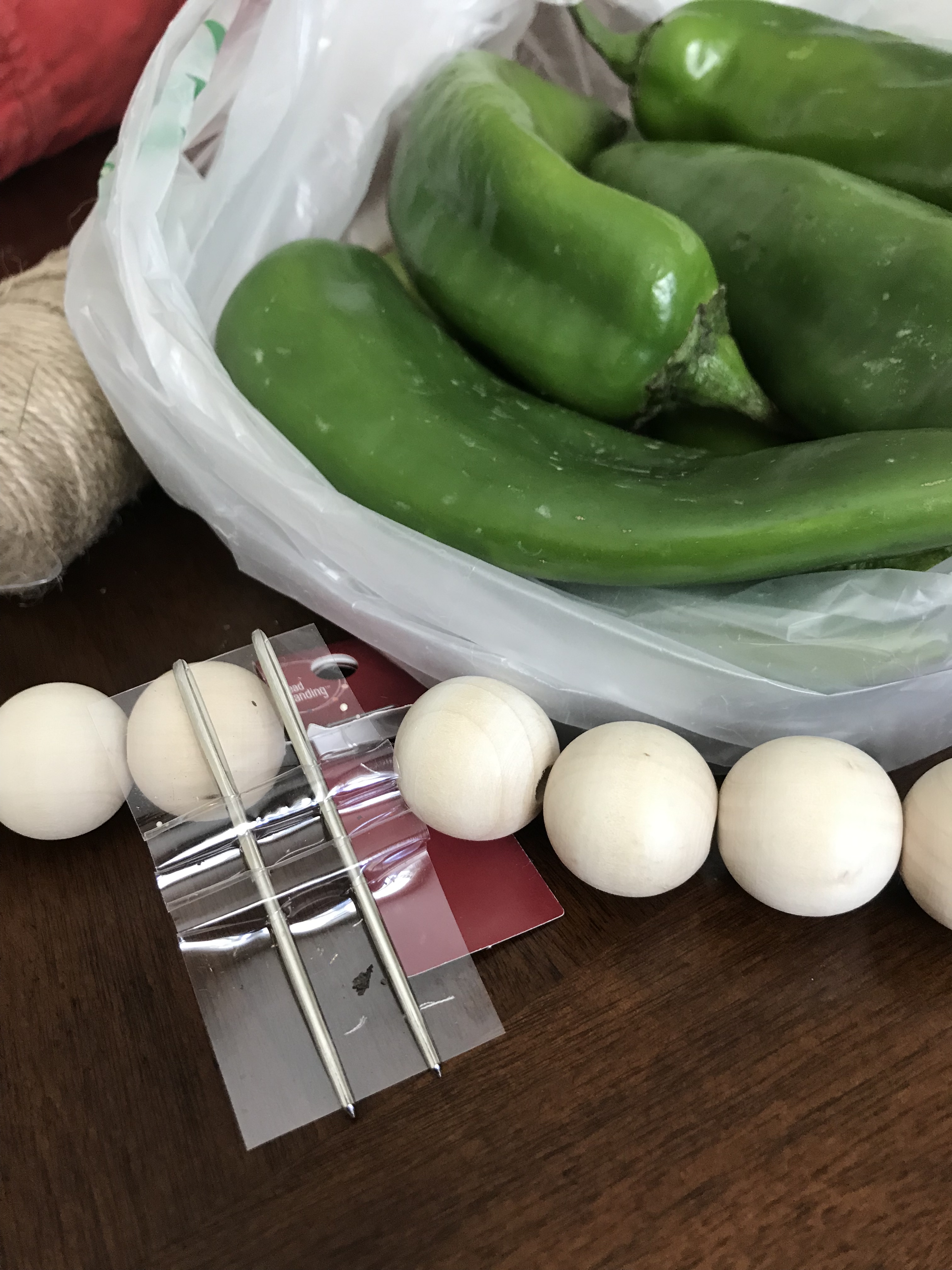 Start with twine, a tapestry needle, chiles, and buttons or beads with holes big enough for the needle.