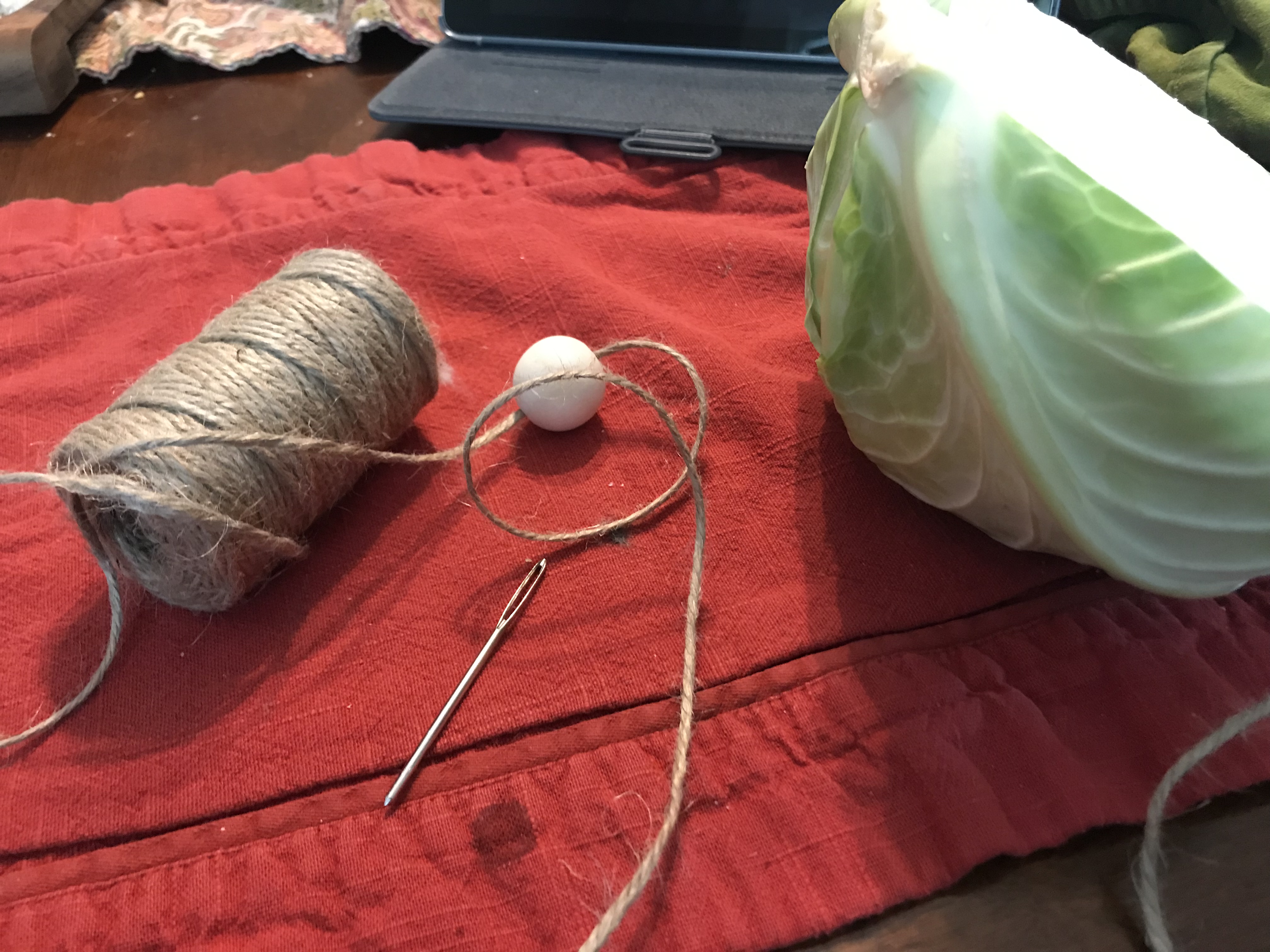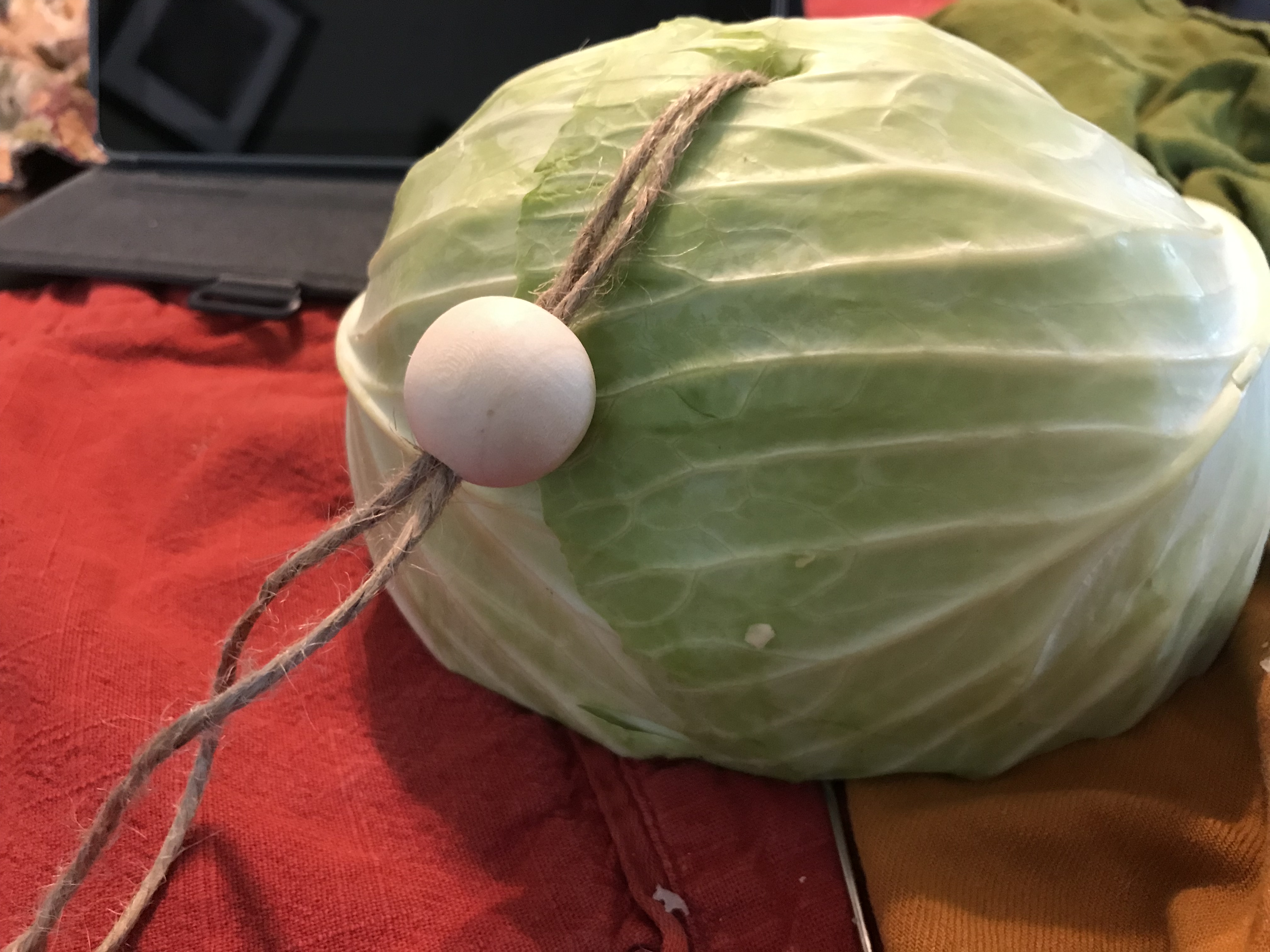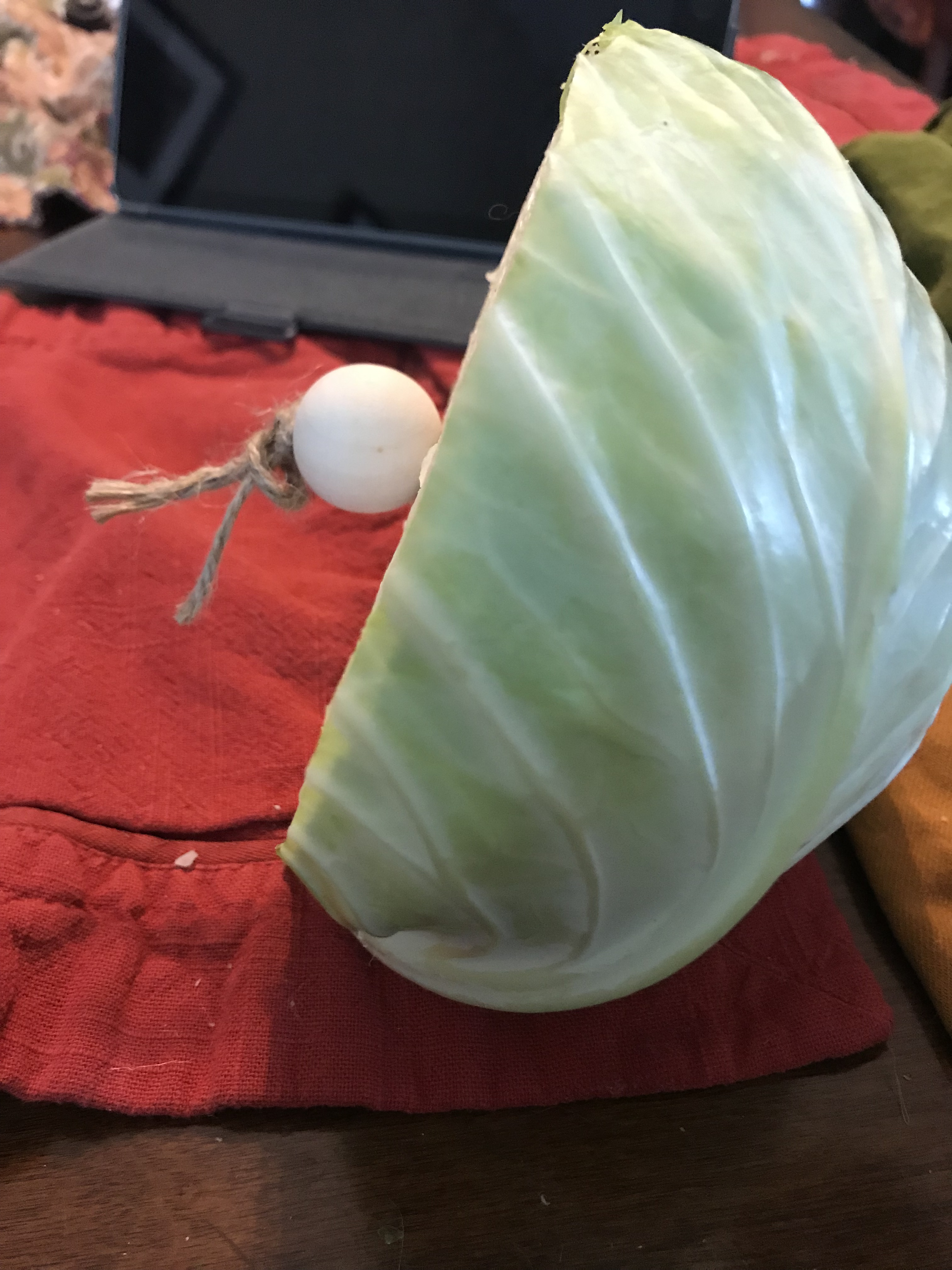 So I finally made a chicken tetherball. Easy enough, take head of cabbage (or half, if your husband bogarts the other half to make sauerkraut).