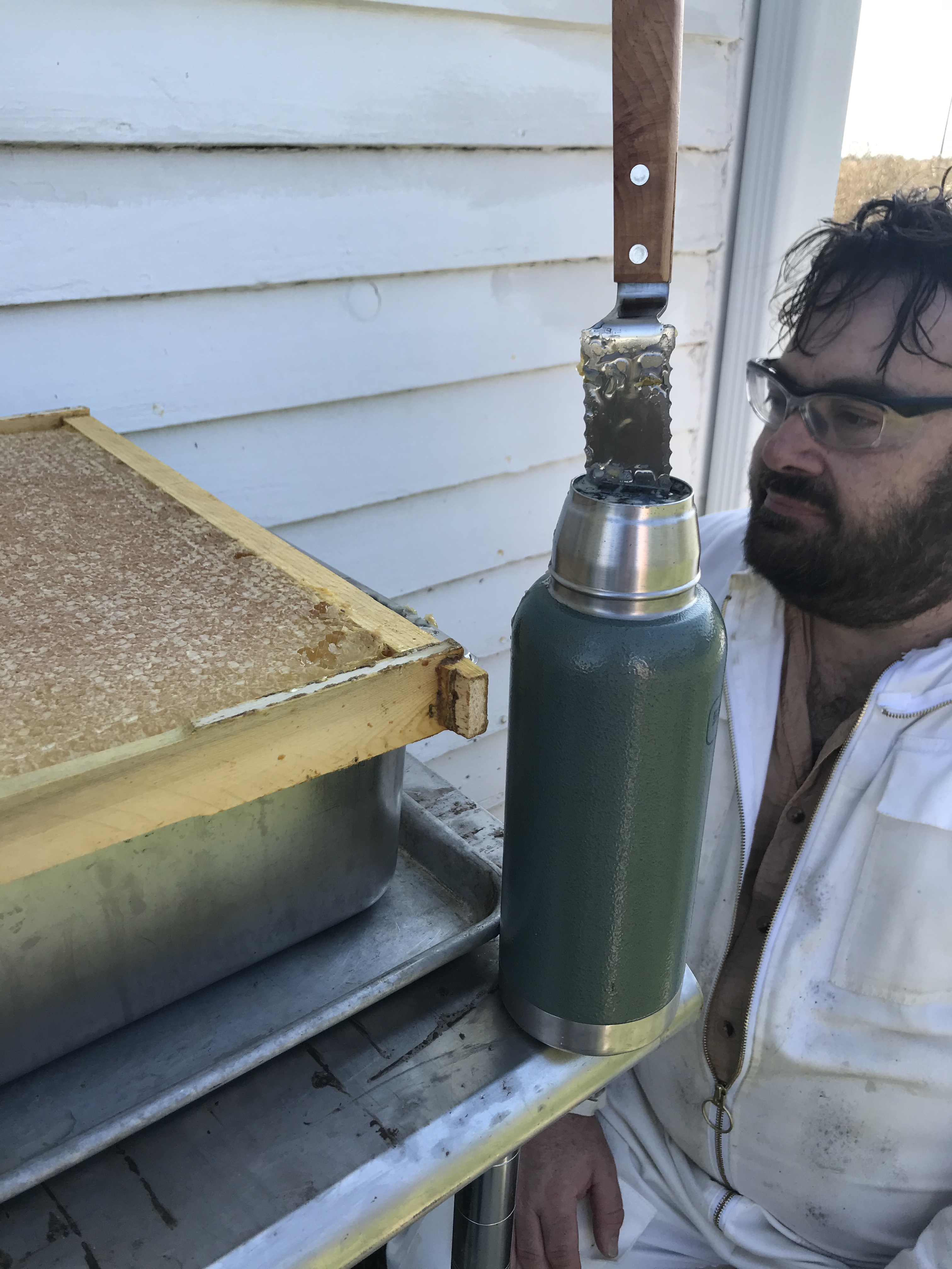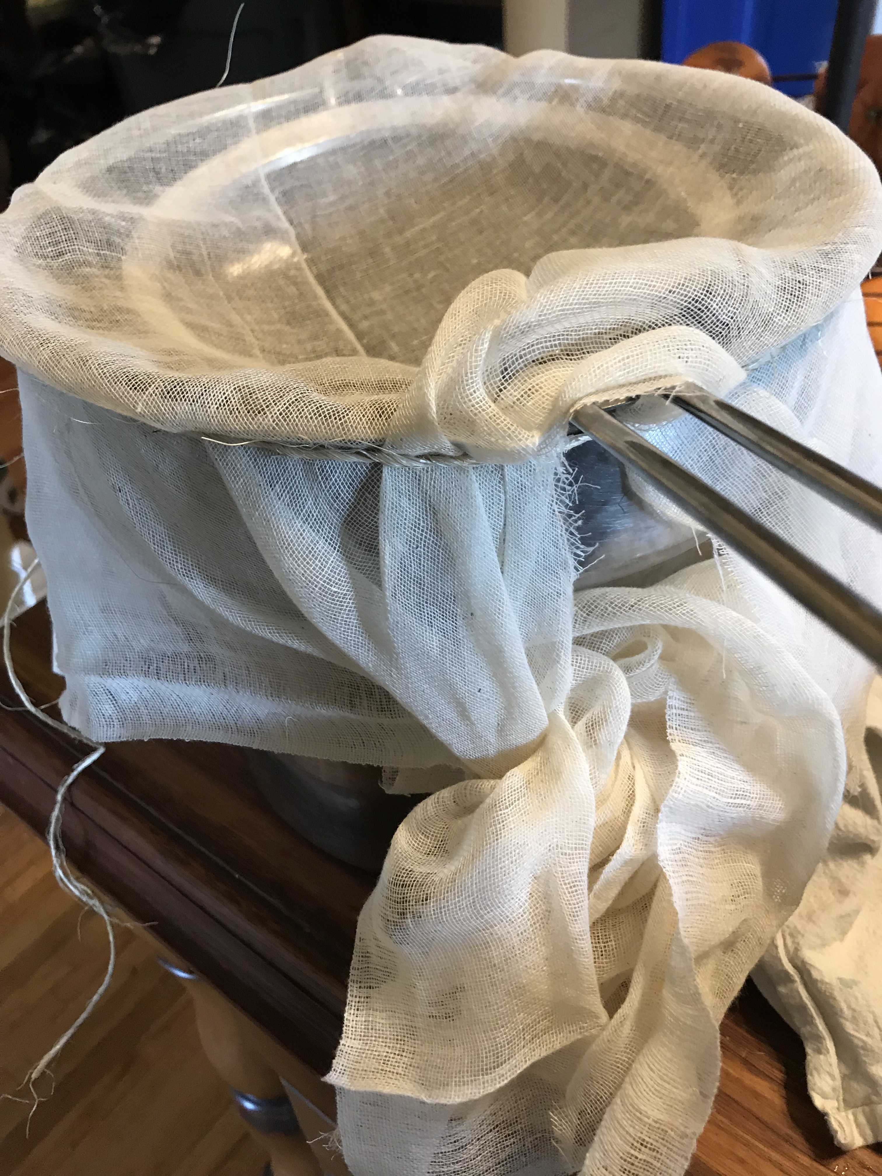We brought in the vat of comb and honey, and made a strainer. One bain marie, a strainer, and some cheesecloth.