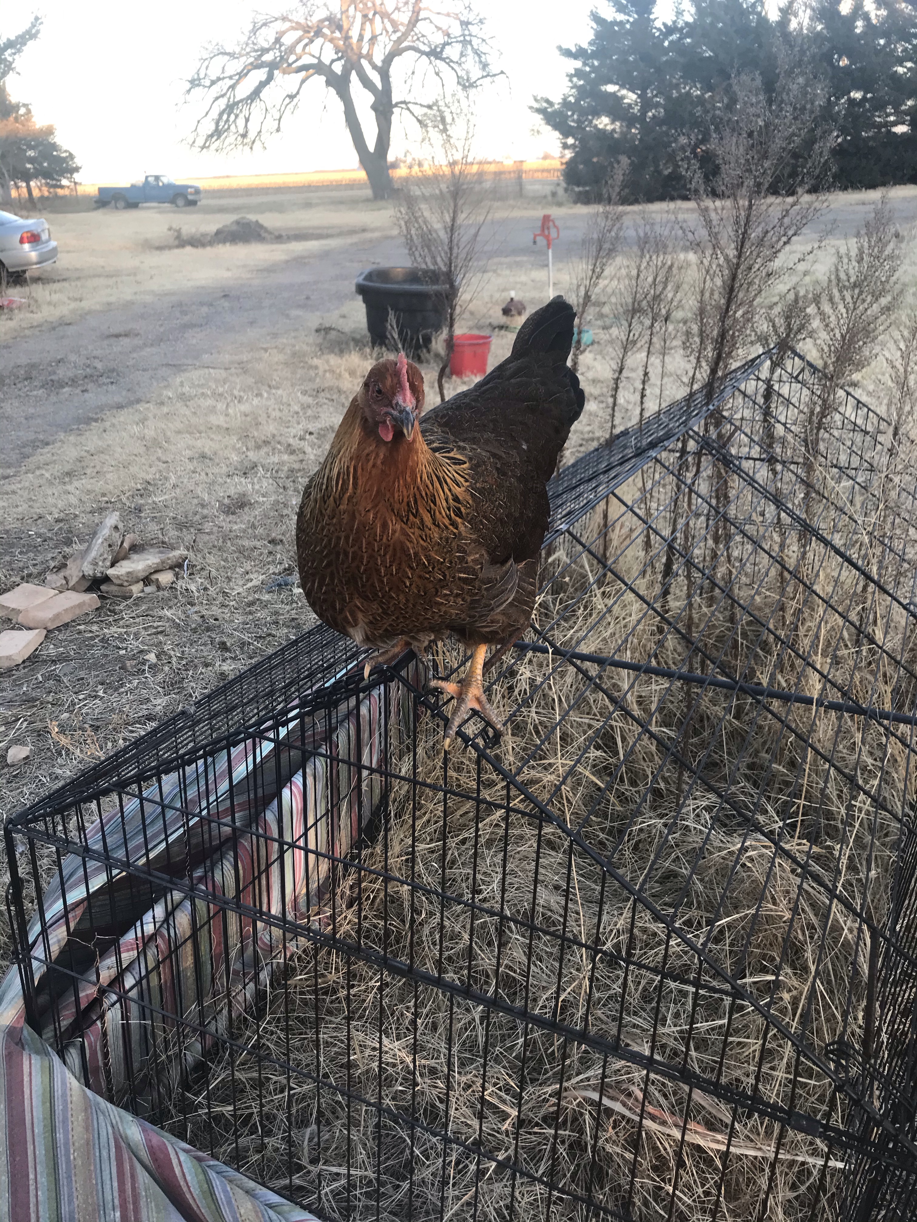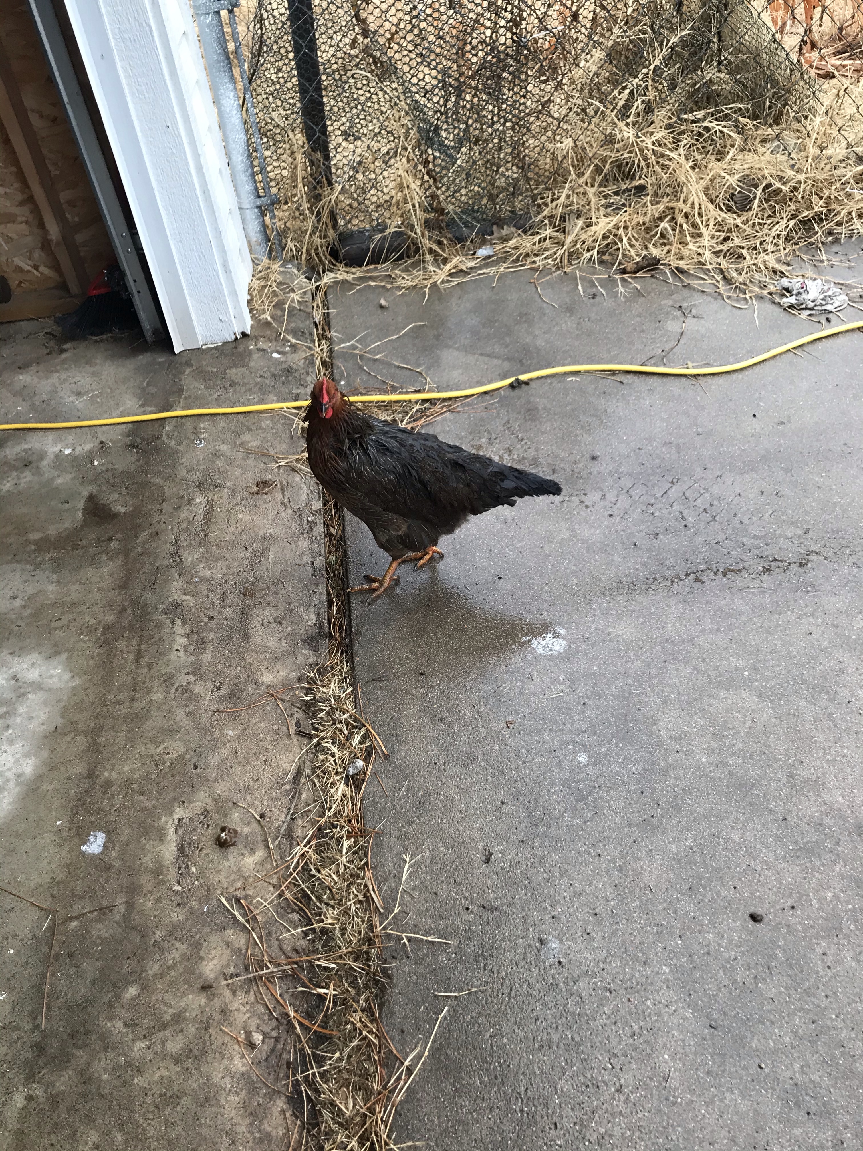 Cheater. Possibly there to avoid (a) the rain, and (b) tow very cranky roosters who spent the morning fighting. We gotta get rid of some of these Roos. Either via auction, or failing that…