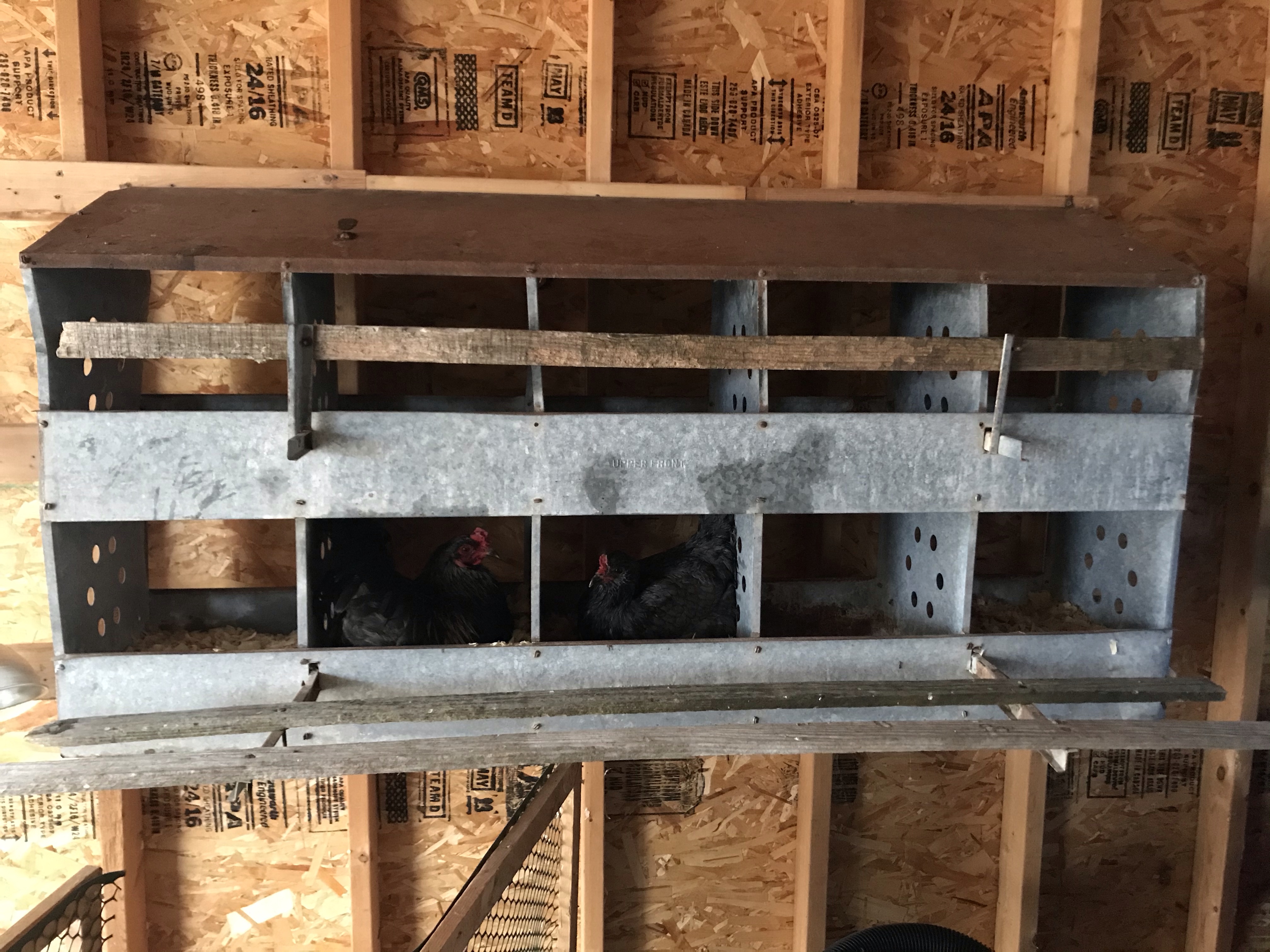 Here we have our $2 nesting boxes. A little beat up, but it works we have been encouraging the chickens today here, with the usual success you have when trying to get chickens to behave.