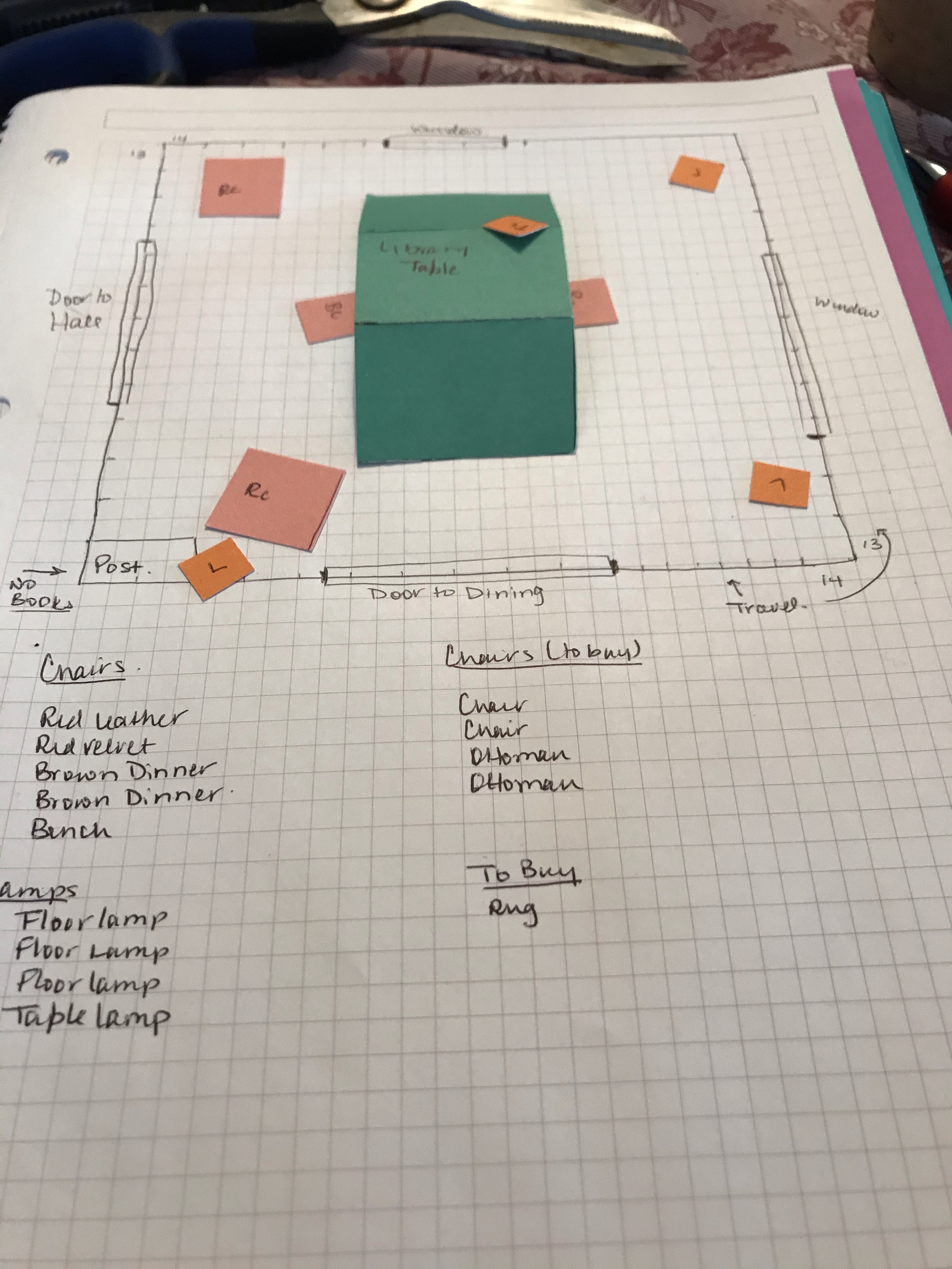 We have the library table, the lamps, and four chairs. We need to get chairs and ottomans. Right now, we have a bench under the window that I would like to make eventually into a nook.