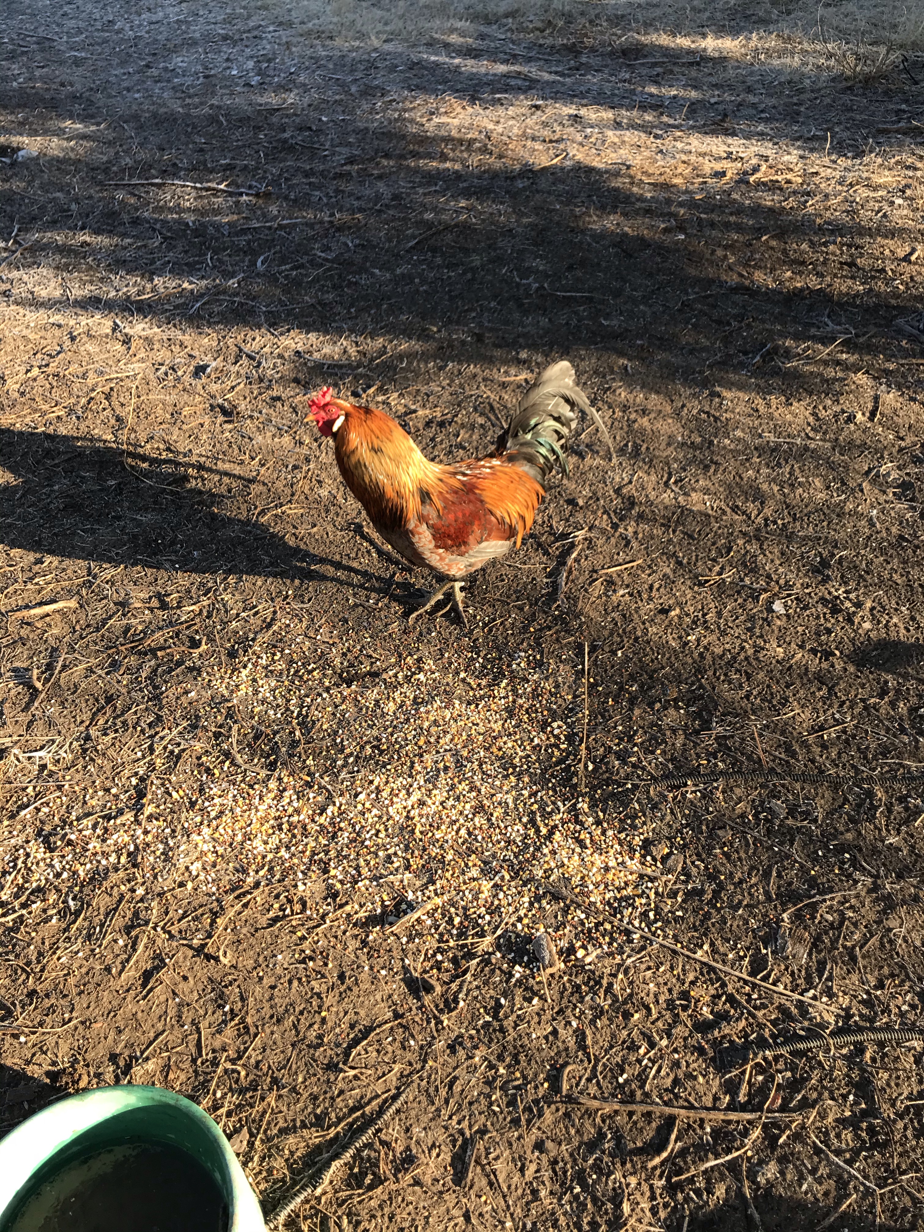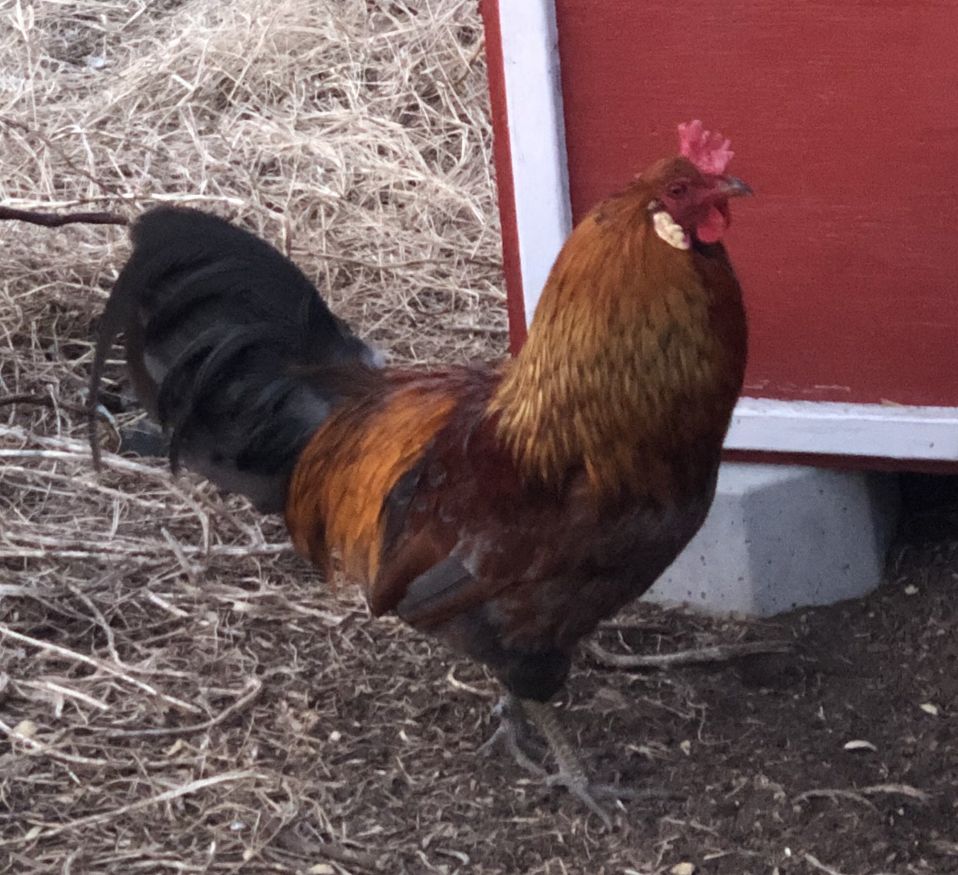 I mean really. How gorgeous is he. The one with the black tail is more docile and lower in the pecking order. We often see him in the morning before we let the chickens out because he wasn’t let in, or if we haven’t latched the egg door, he gets shoved out.