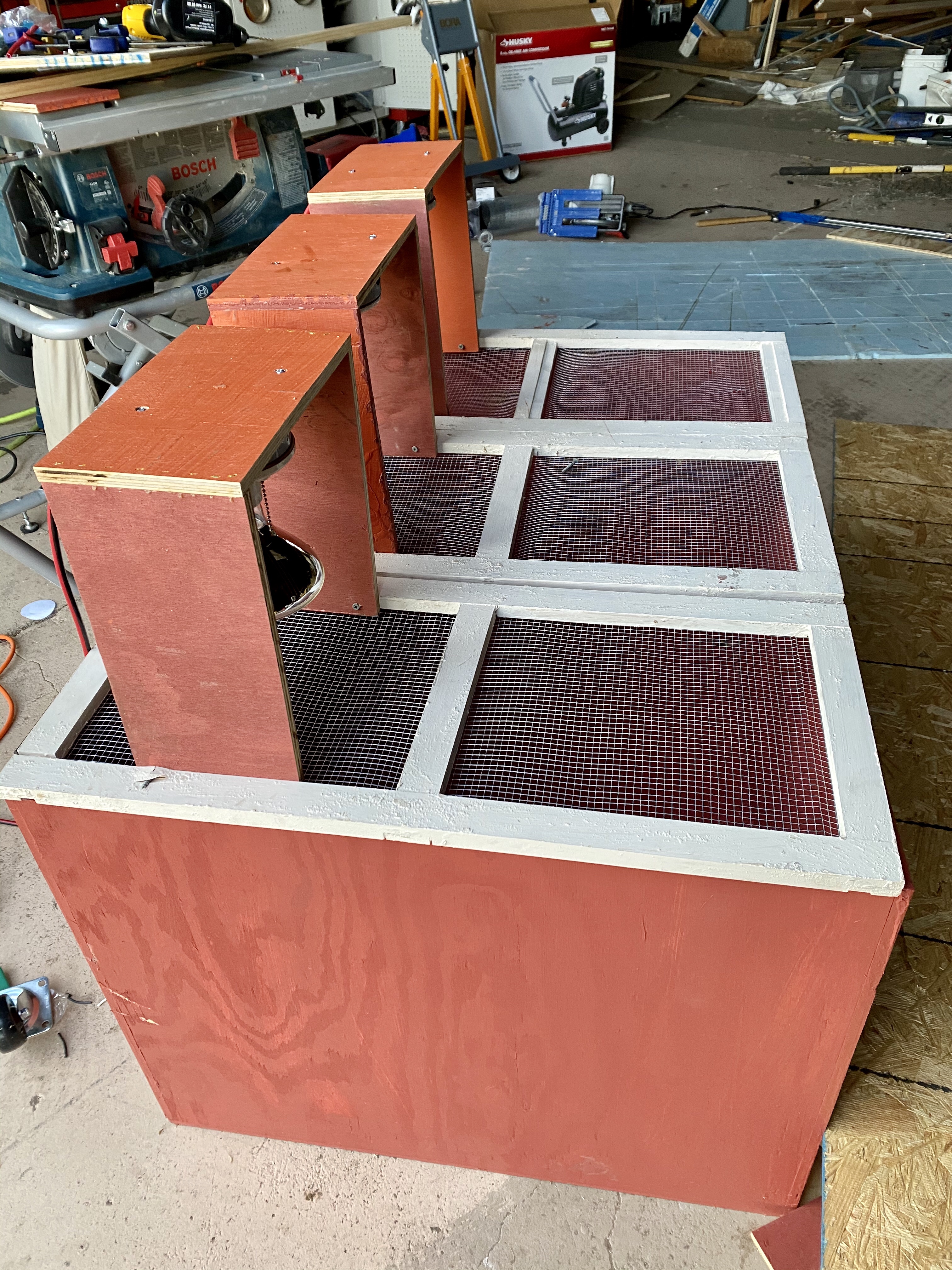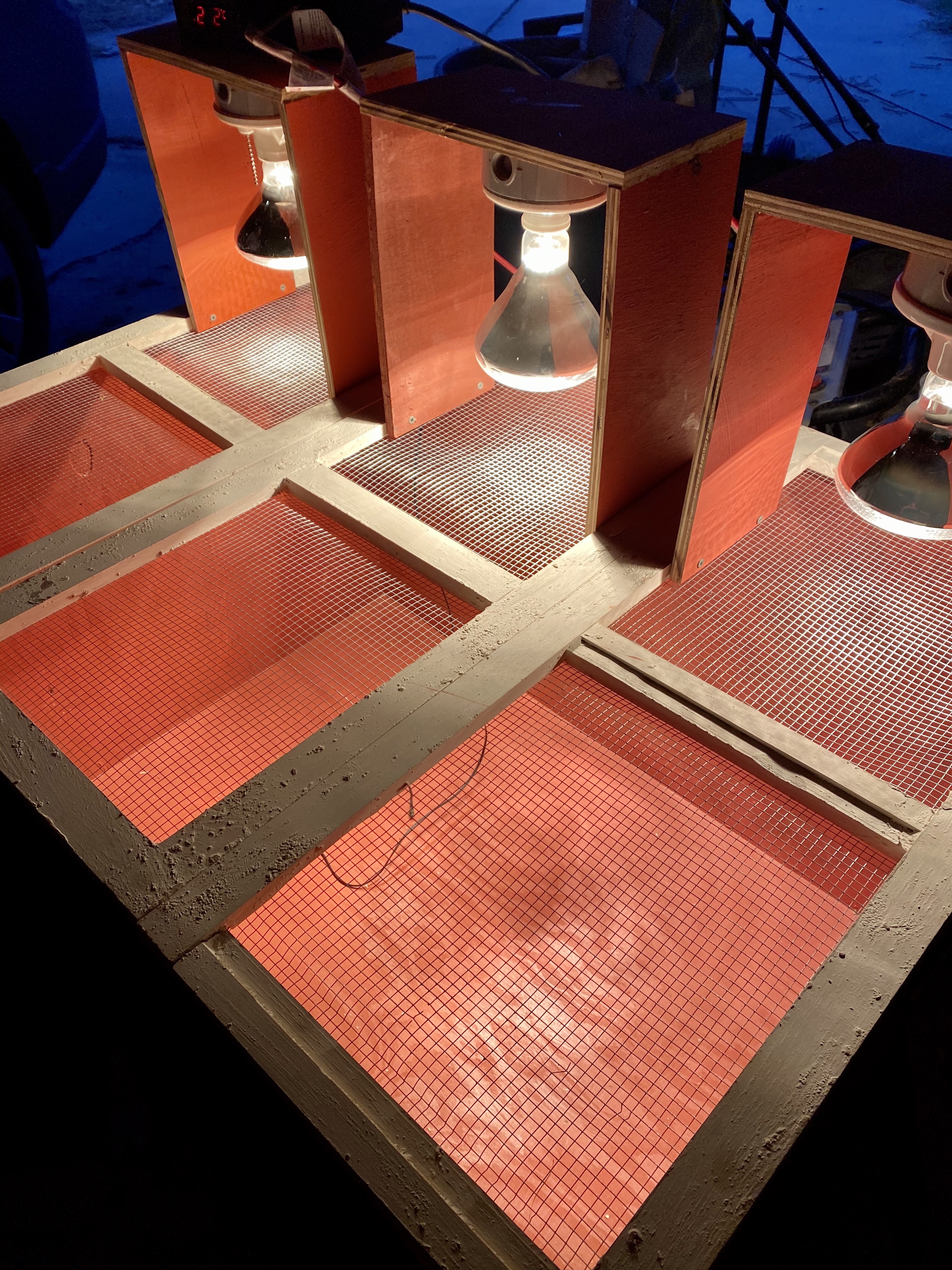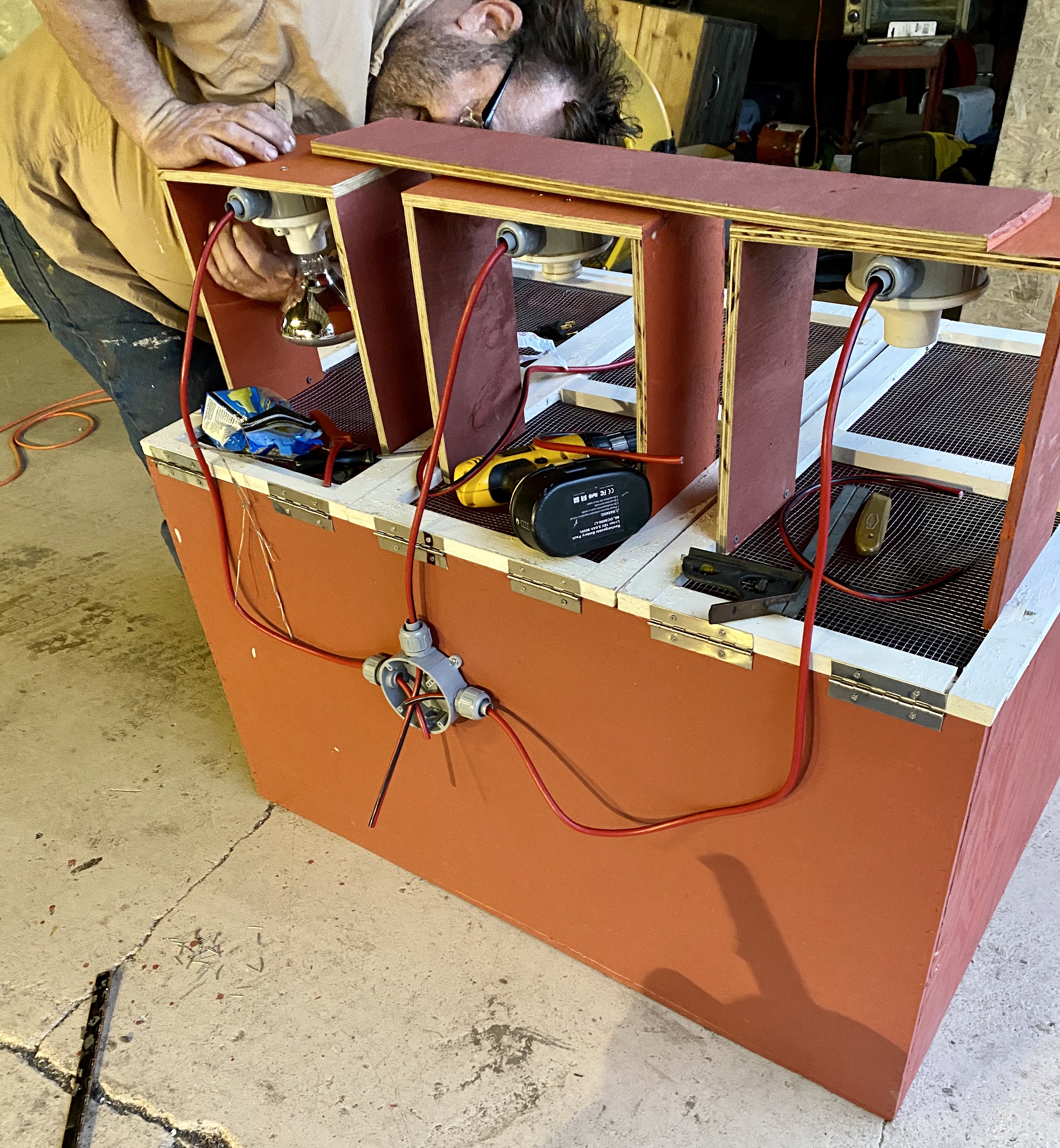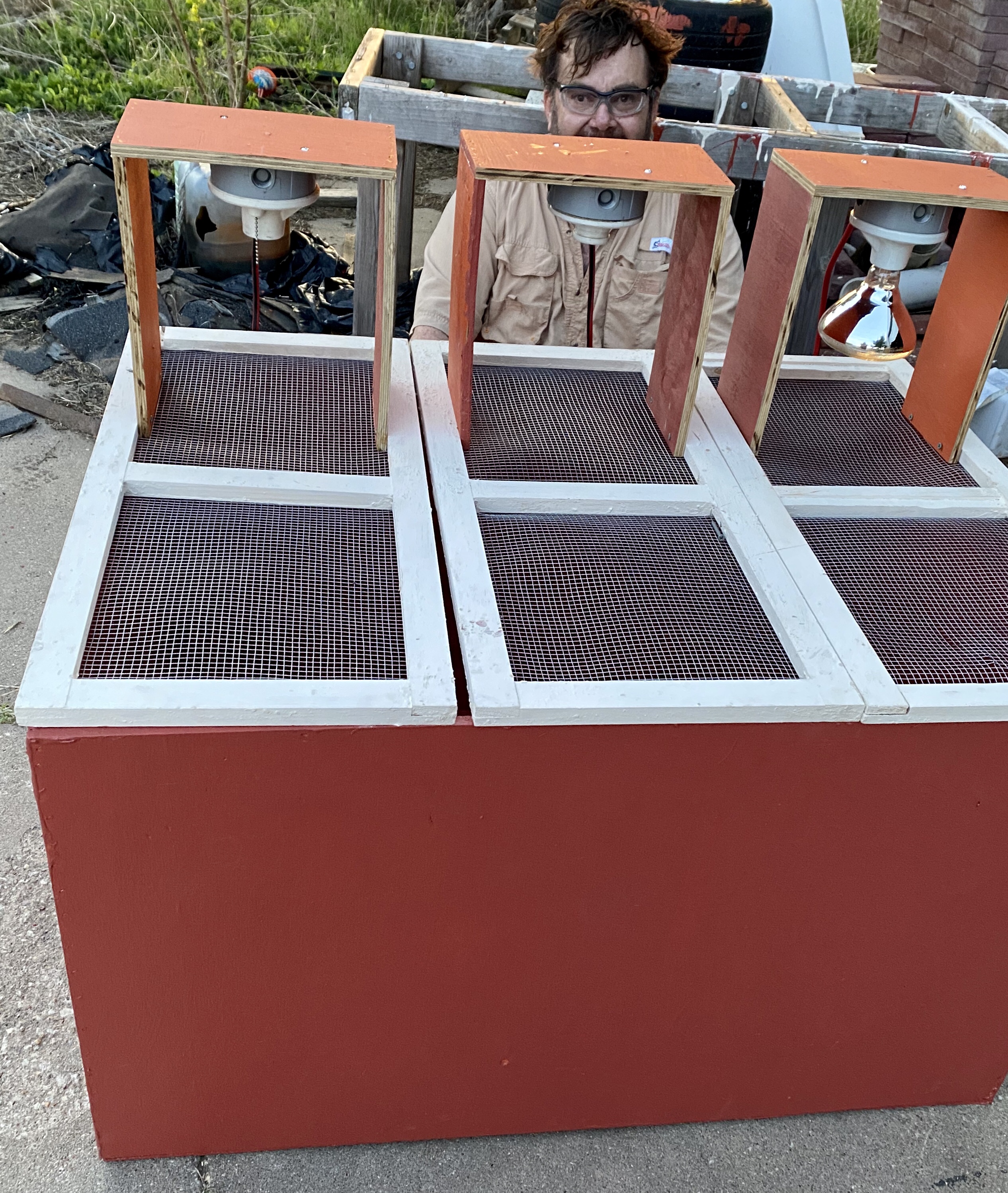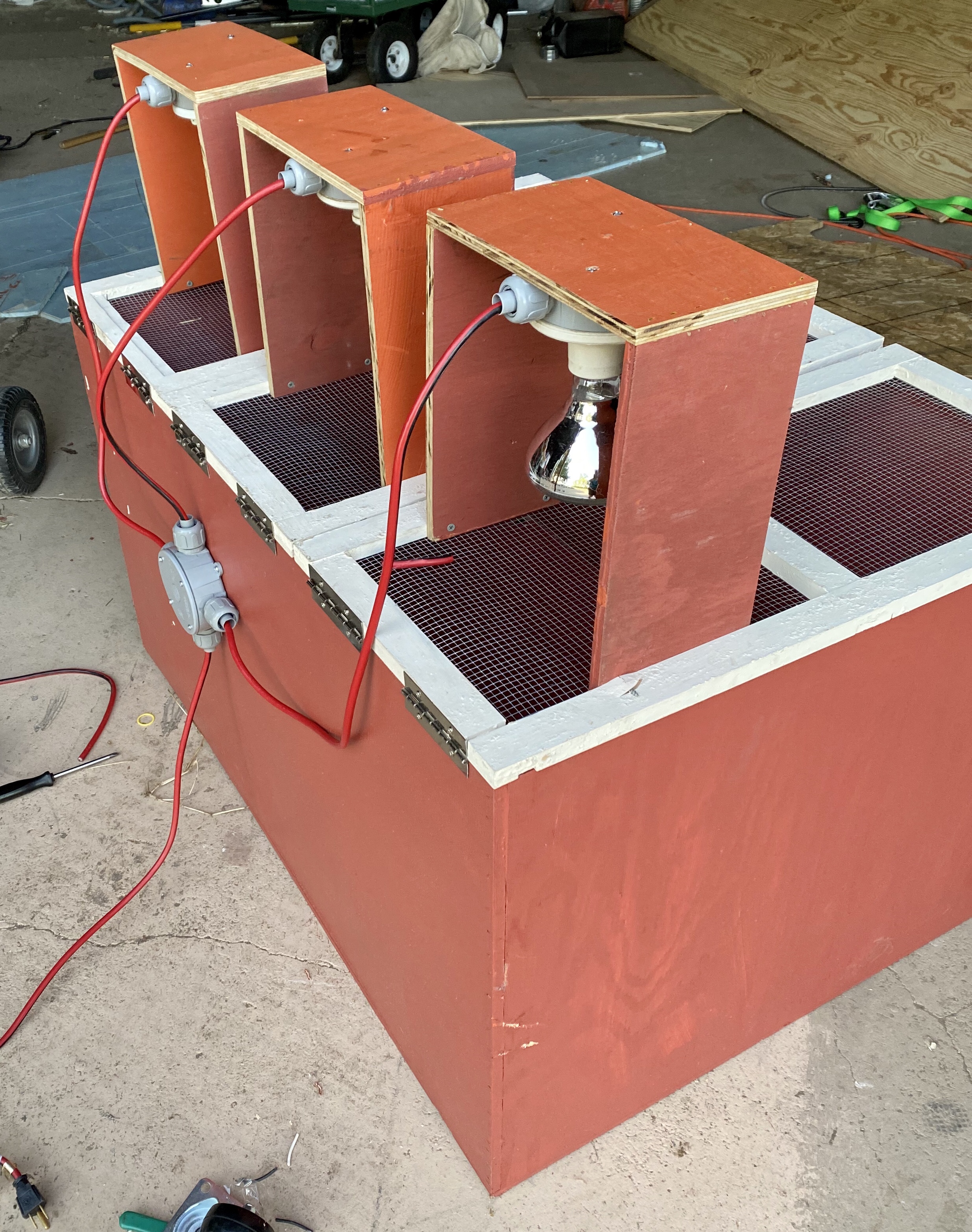 So it’s a big box. The top has three hinged doors with hardware cloth and places for lights. One half will get direct heat, ans they can move away. We can also take out one of the lamps without losing much.