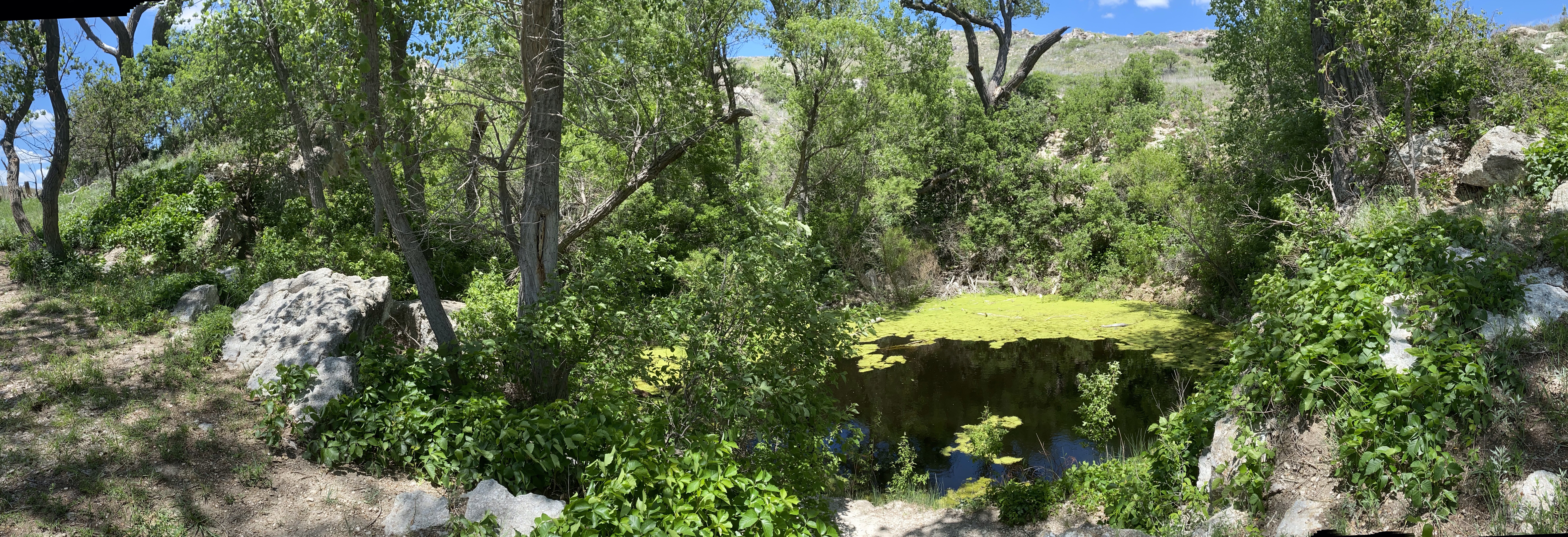 There is a huge cairn on a nearby hill, so that the indigenous people could tell where the spring was.