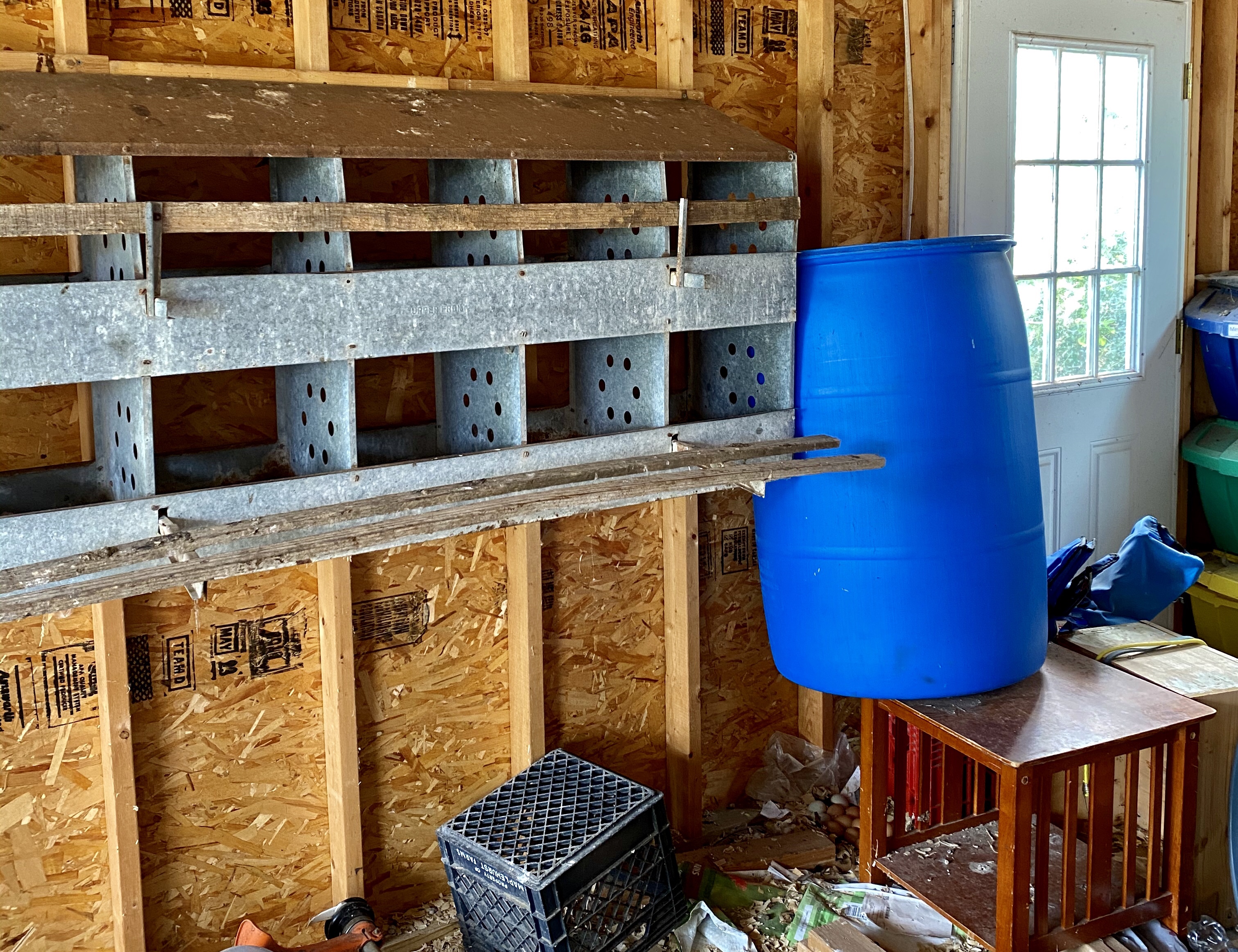 I was out looking for eggs this afternoon. Looked in the nursery coop, nope. Looked in the old coop, yay! Four! Looked in the teenagers’ coop, yay! One! Then went to the nice nesting boxes we have in the garage