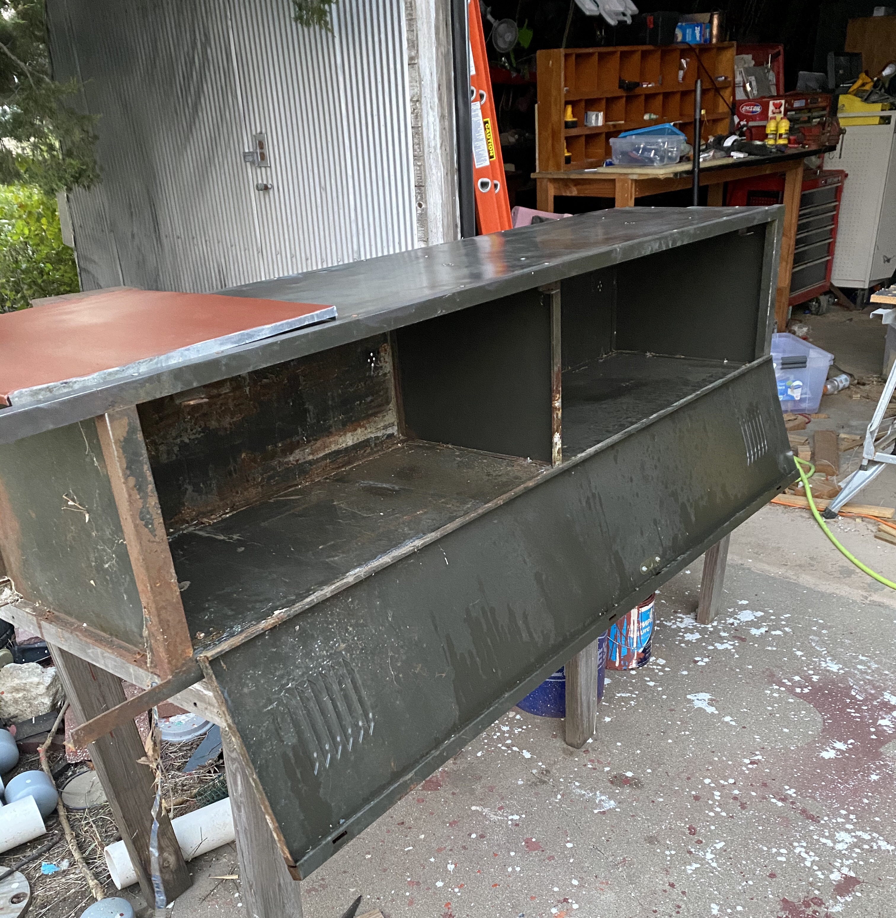Once the metal is cleaned up, we paint. The Husband’s first is blue for dangerous chemicals. Mine will be red and used for egg/honey sales materials.