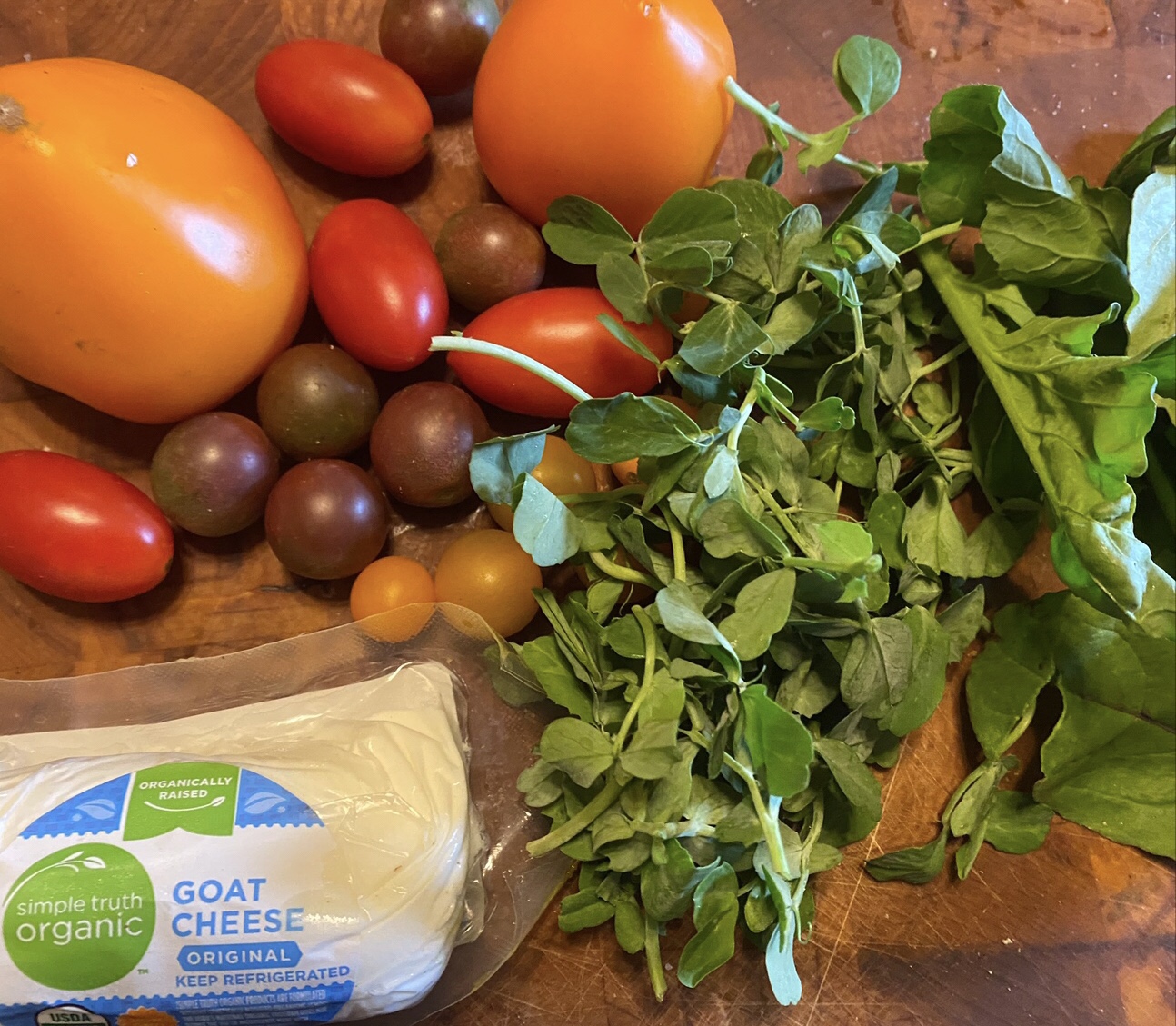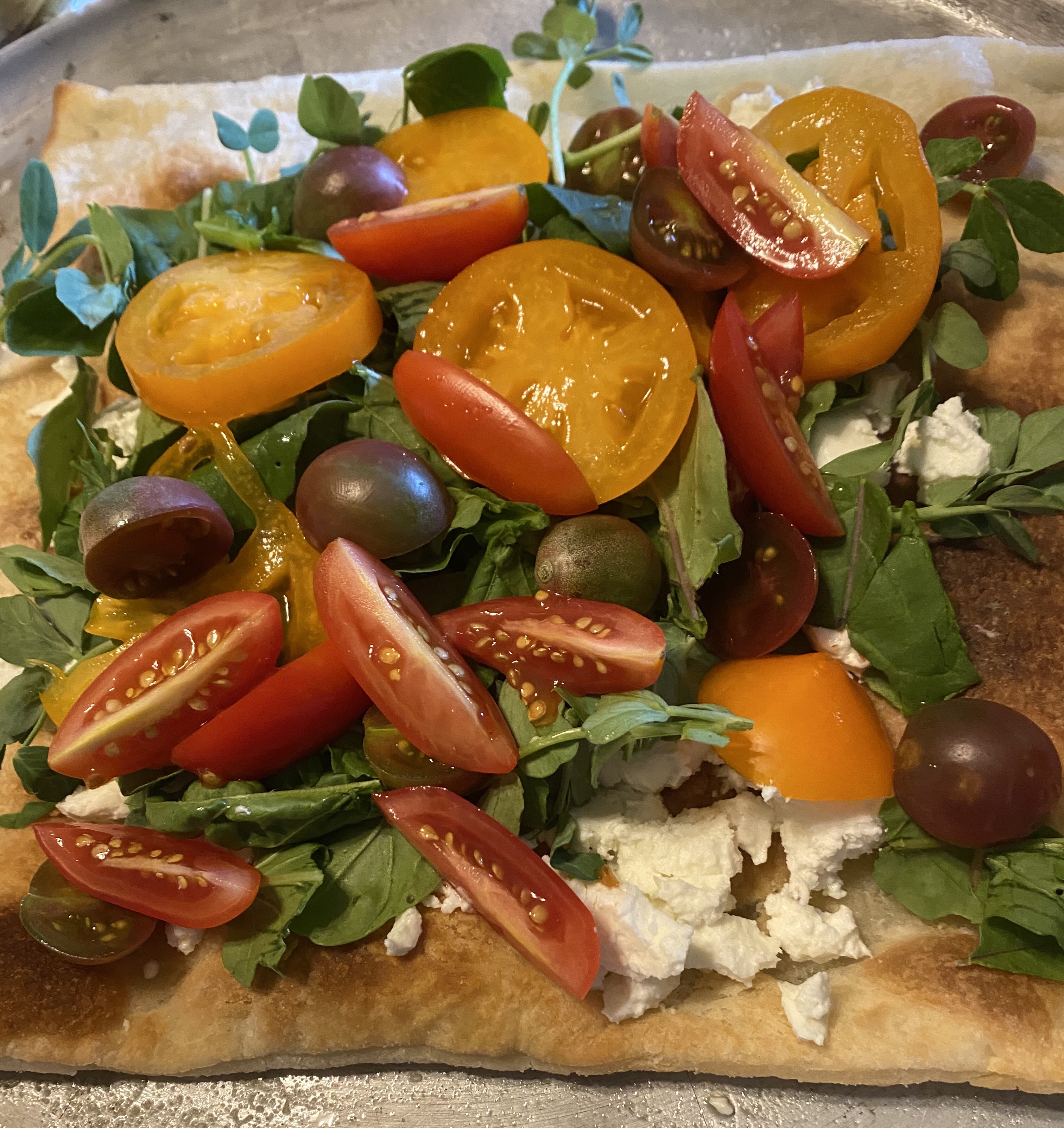 Crumble goat cheese (or mozzarella, or feta, or whatever softer cheese you like). Put on the tomatoes and other stuff. Salt and pepper. Then put in the oven for 16 minutes.