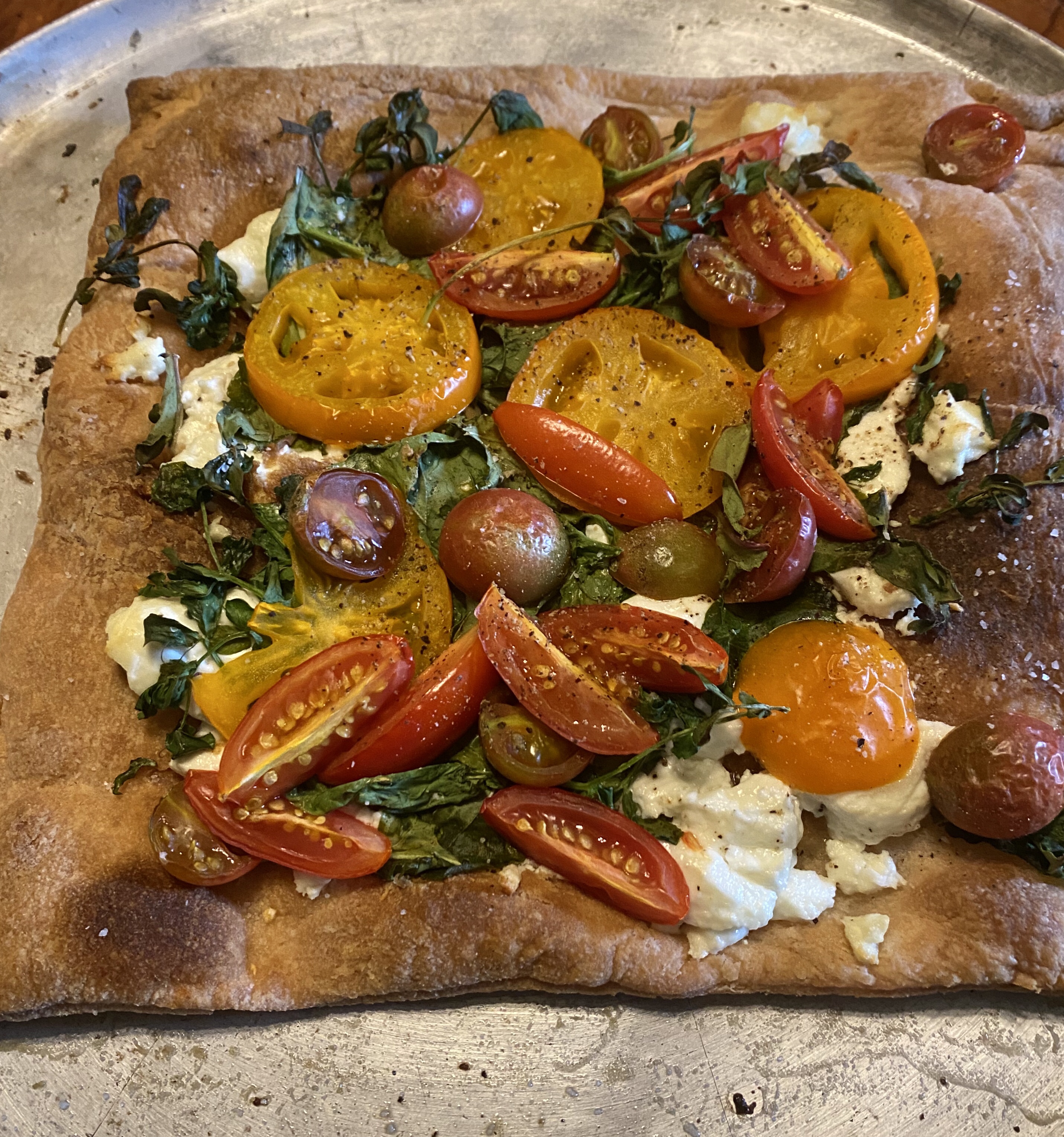 Slice your tomatoes and other toppings. I considered some prosciutto from La Quercia, but kept it simpler this week,