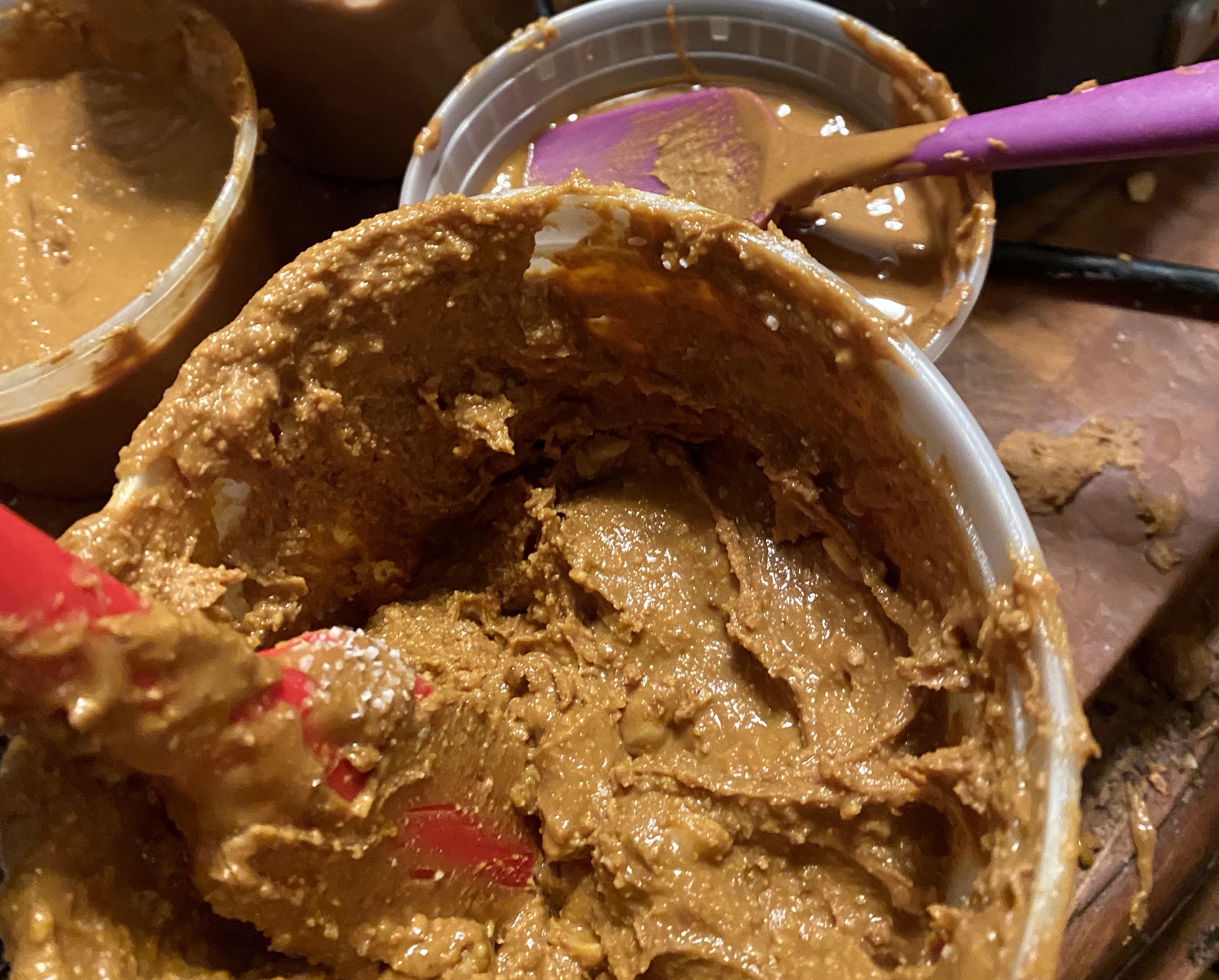 Once all of the peanuts are roasted, put them in the cuisinart. Process until the oils come out. It will be a powder first, then eventually it will start to get oily. You shouldn’t have to put in any excess oil, unless you want to. Put in salt to taste.