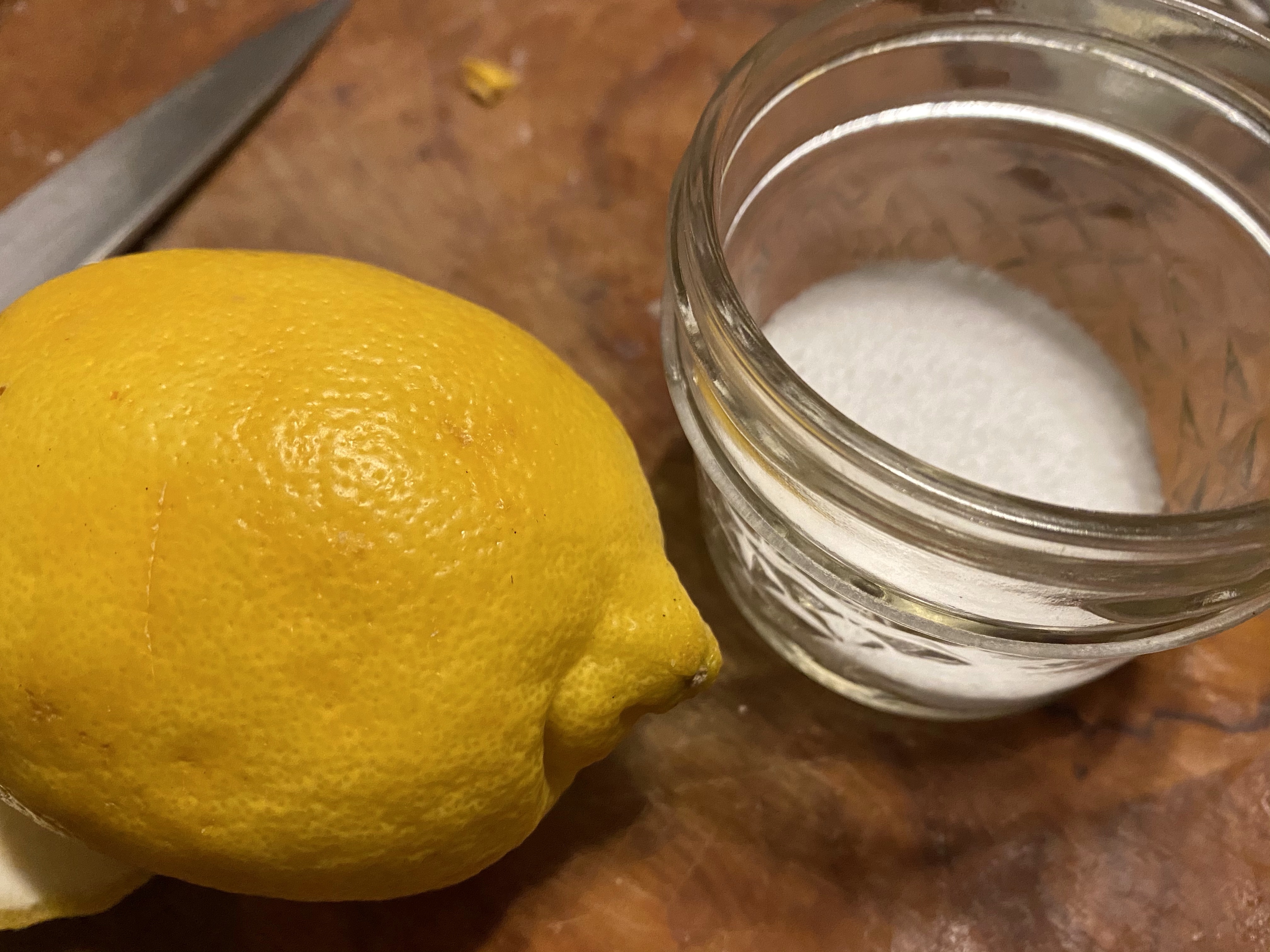 Start with a small jar, two lemons and salt. Many recipes are for large jars, but we don’t use them a whole, whole lot, so a small jam jar works just fine.