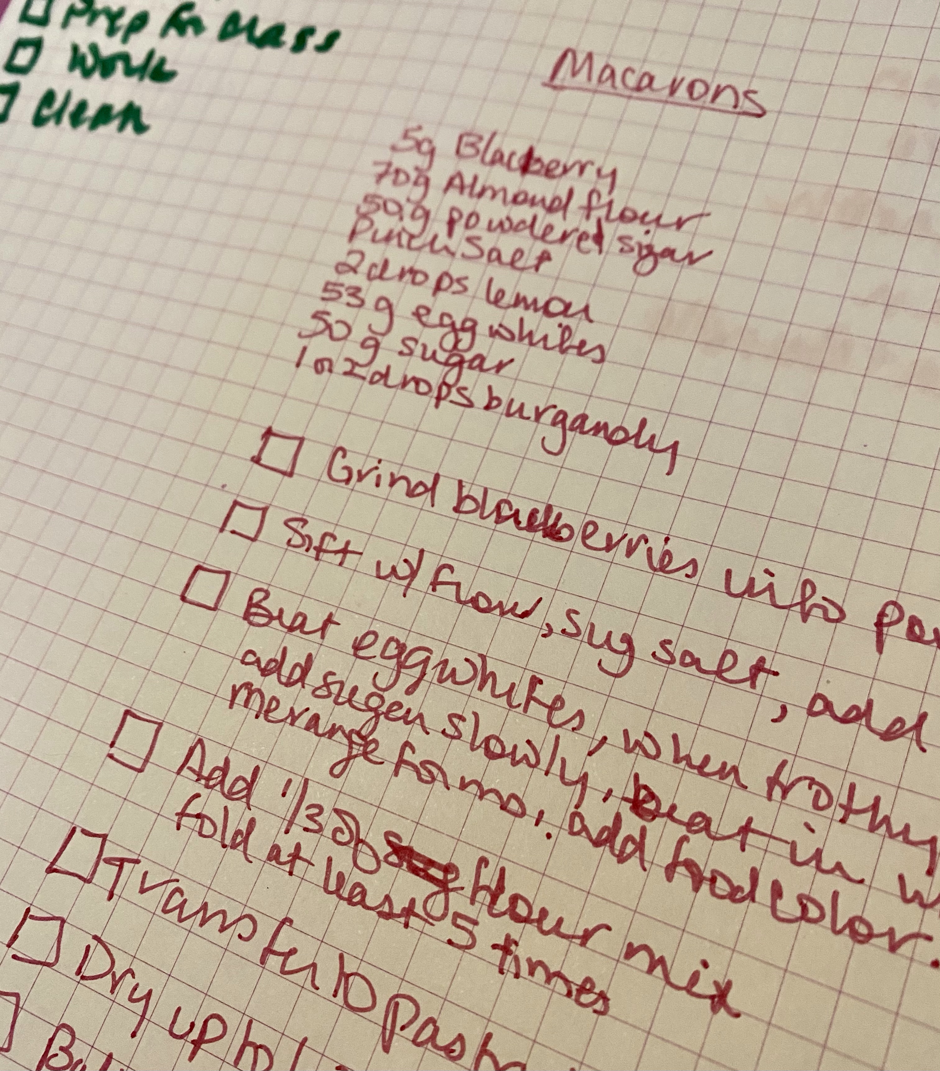 Started by reading the method all the way through. Writing things down helps me retain, so I rewrote the method with my changes. The book has a blueberry recipe, but I’m not a fan of blueberries, so I’m doing blackberry. It pairs well with lemon, so I’m going to do a blackberry lemon cookie with a lemon buttercream filling.