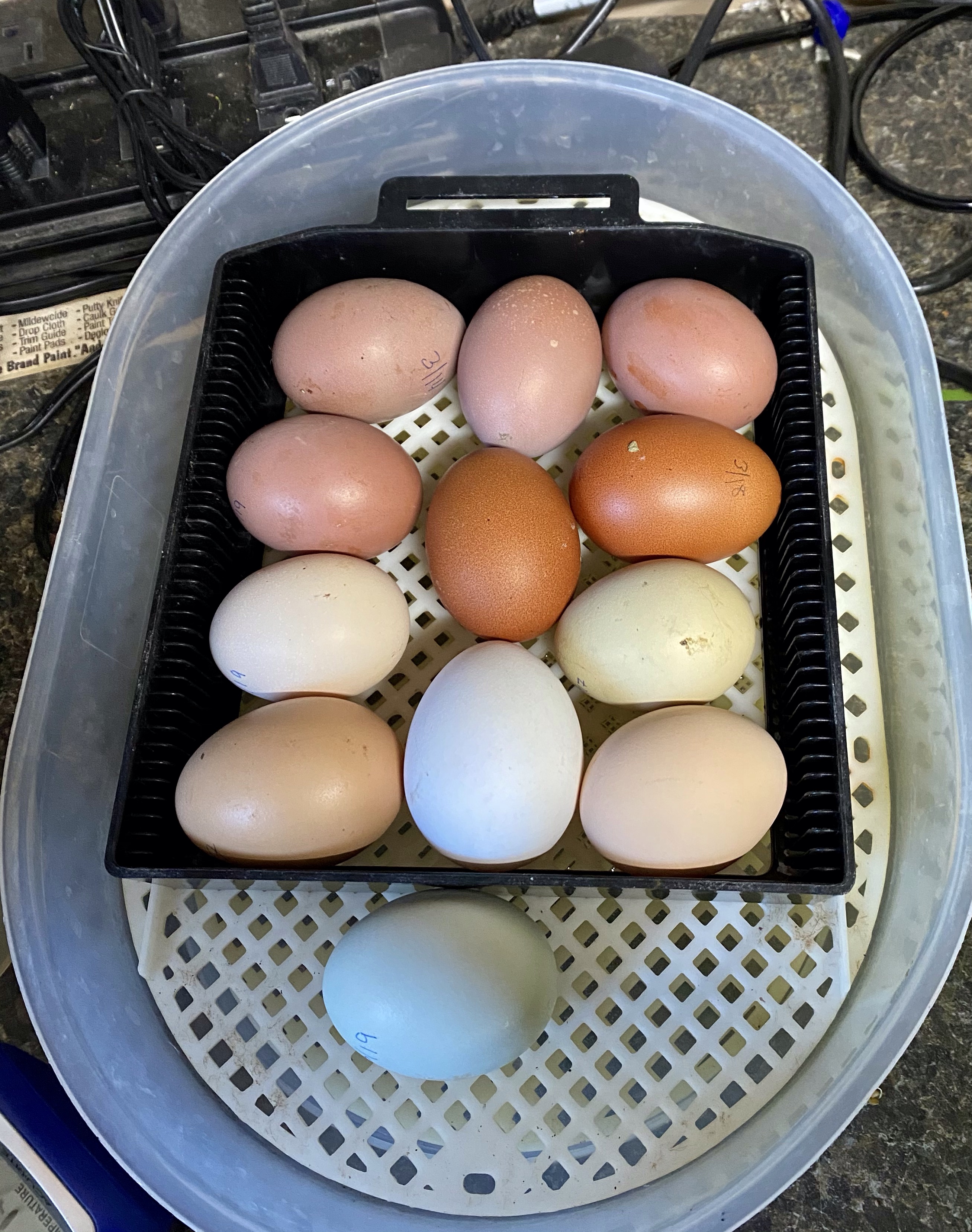 I couldn’t stand it. We had our 12 eggs (which don’t quiiiite fit in the incubator) all ready to go, so I started them on Friday night, instead of Saturday. This will be good as we need to pick up our bees on the tenth, and this will get us started on the hatch early.