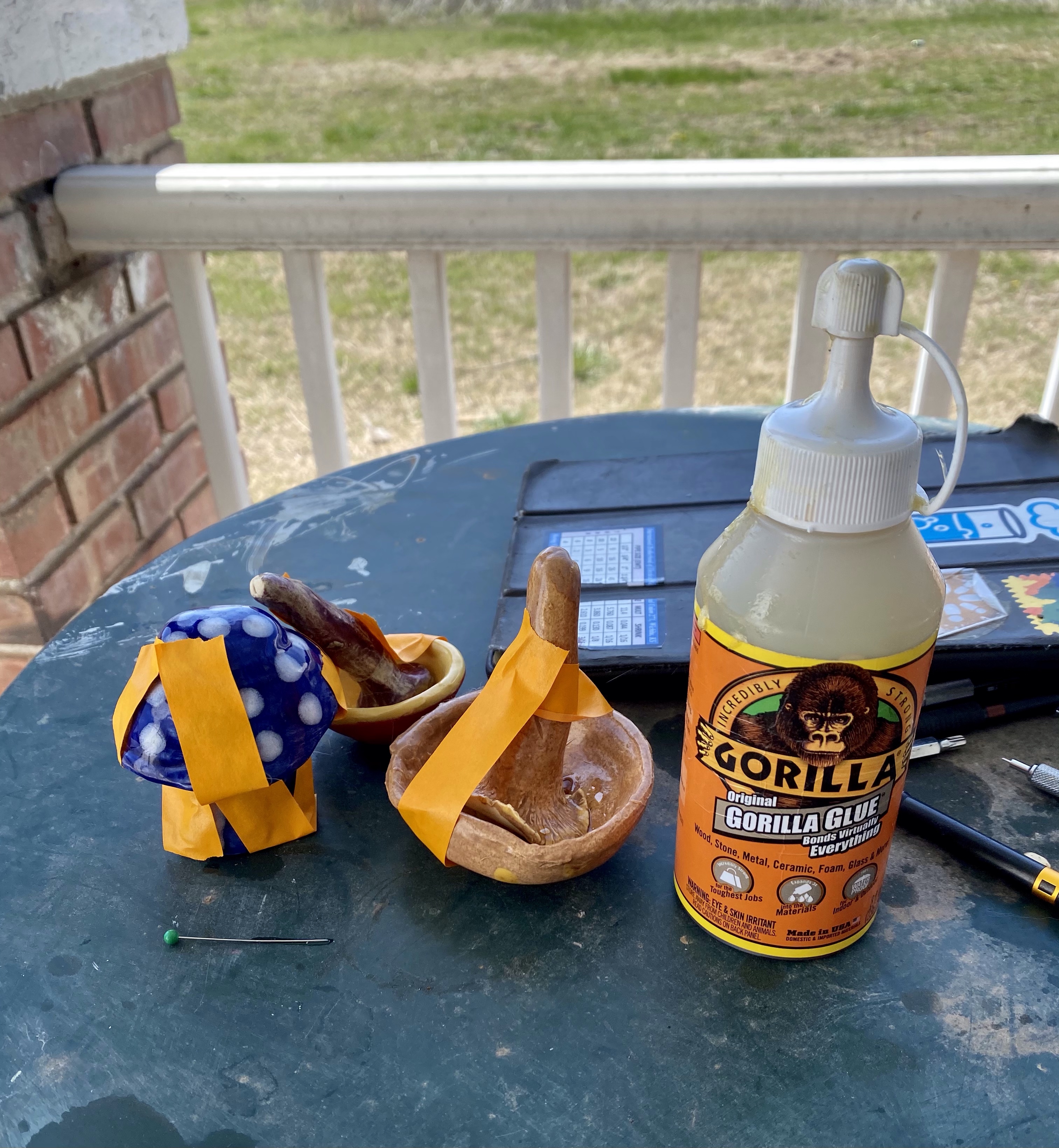 Well, we made it. The Husband helped. We used an extruder for the skep, a wheel for the base, and hand shaping for the mushrooms.