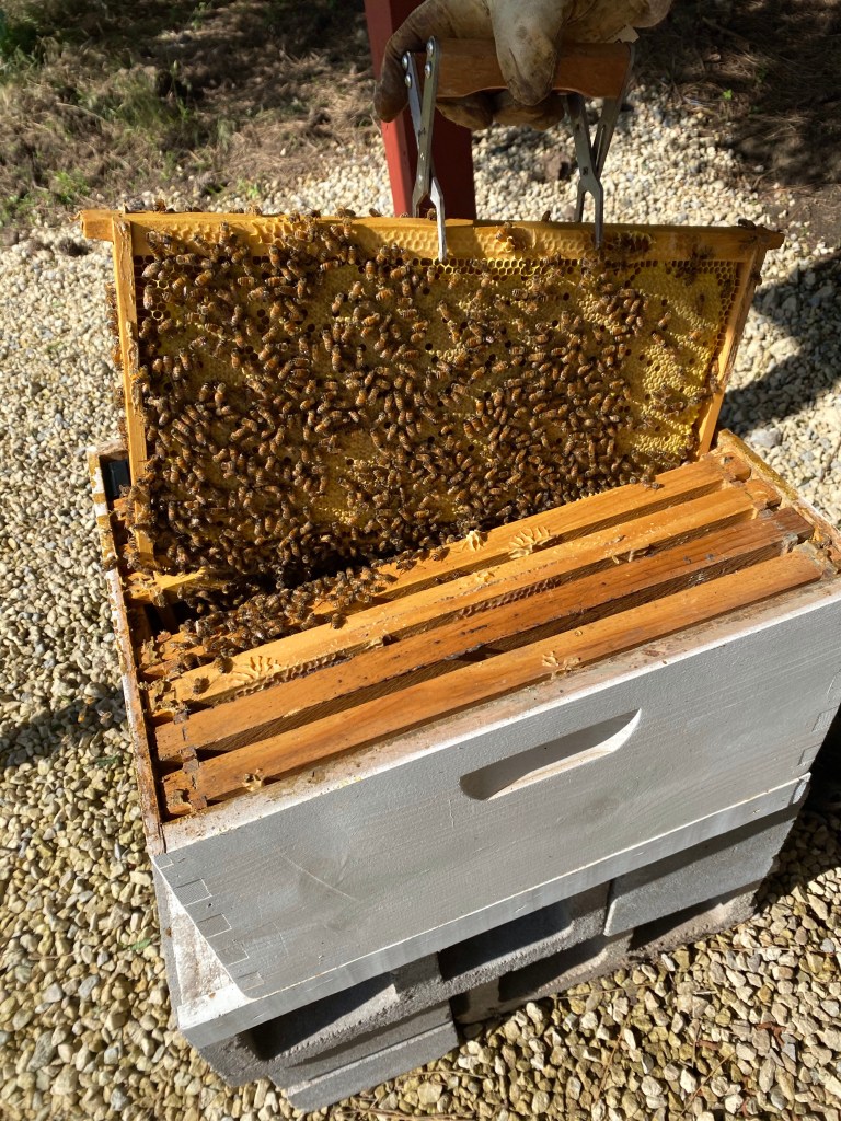 We started with the south hive. It was doing pretty well. It was about 60% full once we replaced the feeder with frames.