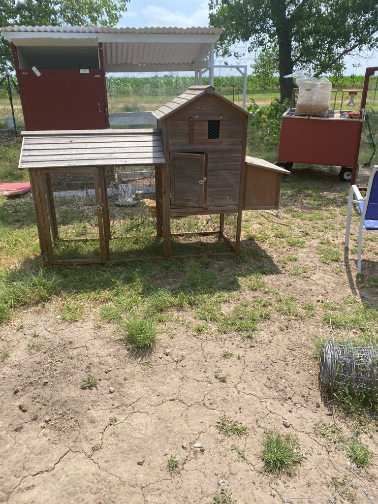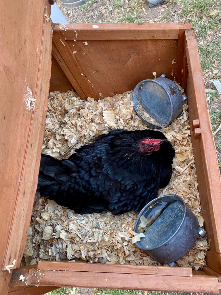 We’ve been meaning to move her to the nursery coop, but *gestures widely*. So finally on Sunday we moved the coop from the old yard to the new one.
