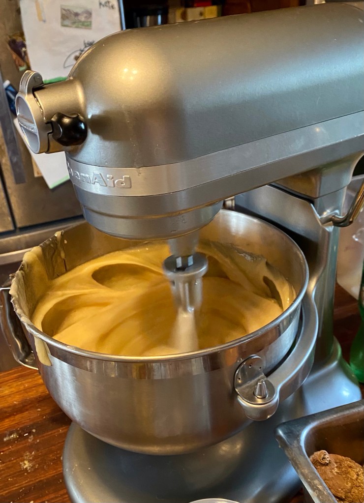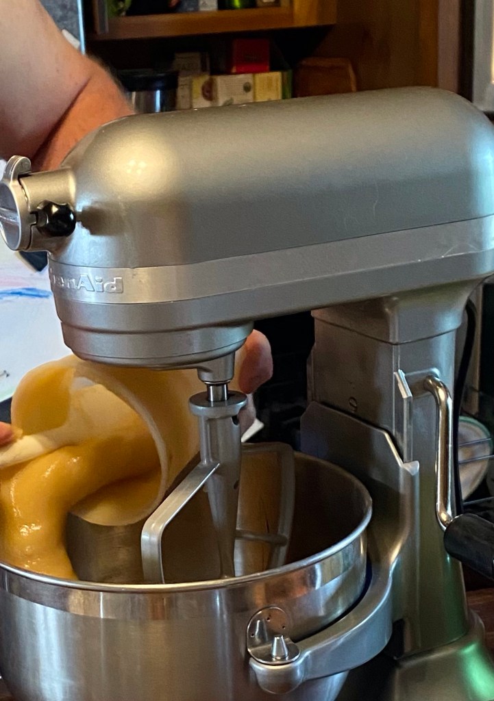 With the batter paddle, begin to mix. Mix on high for twenty minutes. Let rest for about an hour, then mix on high for 20 minutes. Repeat until creamy.