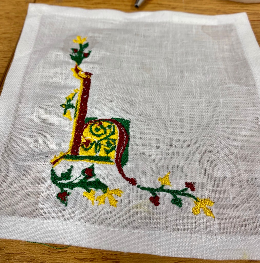 So, in that vein, I found some simple illuminated letters and embroidered them on cocktail napkins. It ended up taking longer than expected, so some of them aren’t done yet, but I have proof of concept for all of them.