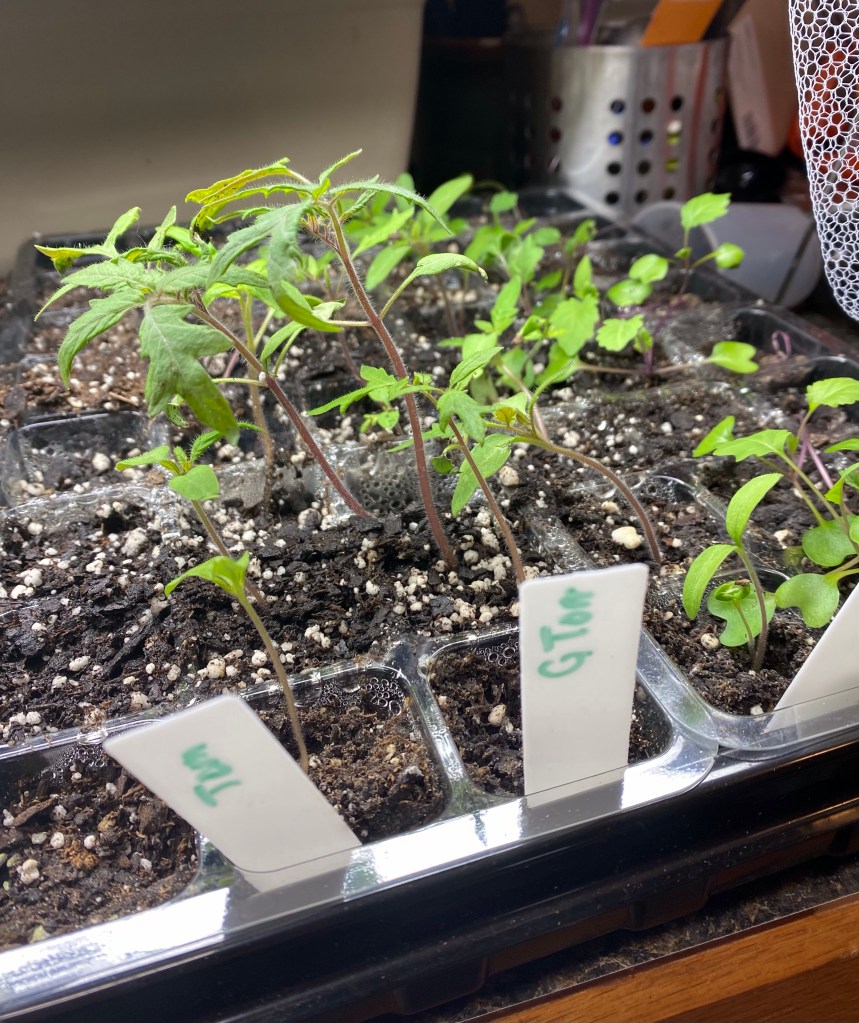 We start with grape tomatoes. They are still a bit leggy, but looking better than usual.