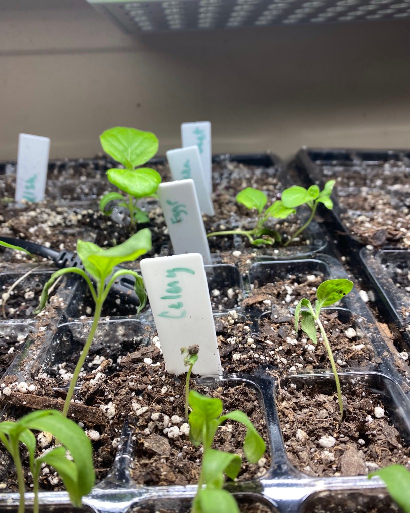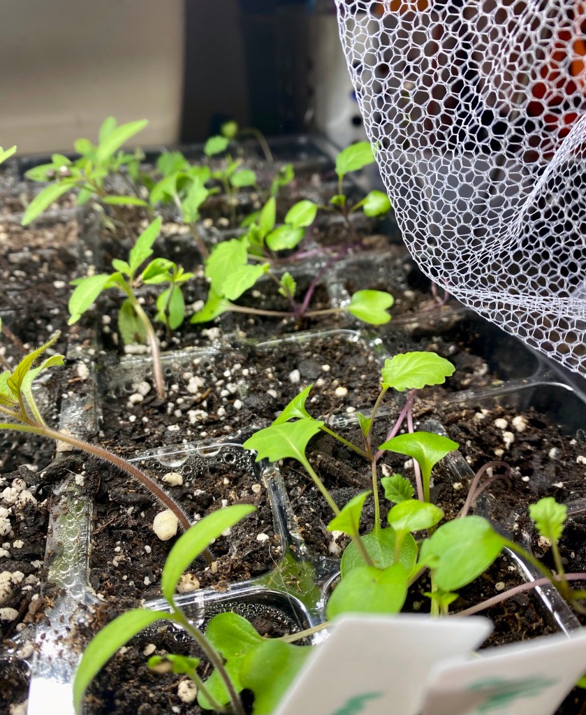 So now I’ve got the seedlings under the light, with netting over all of it. It definitely helps.