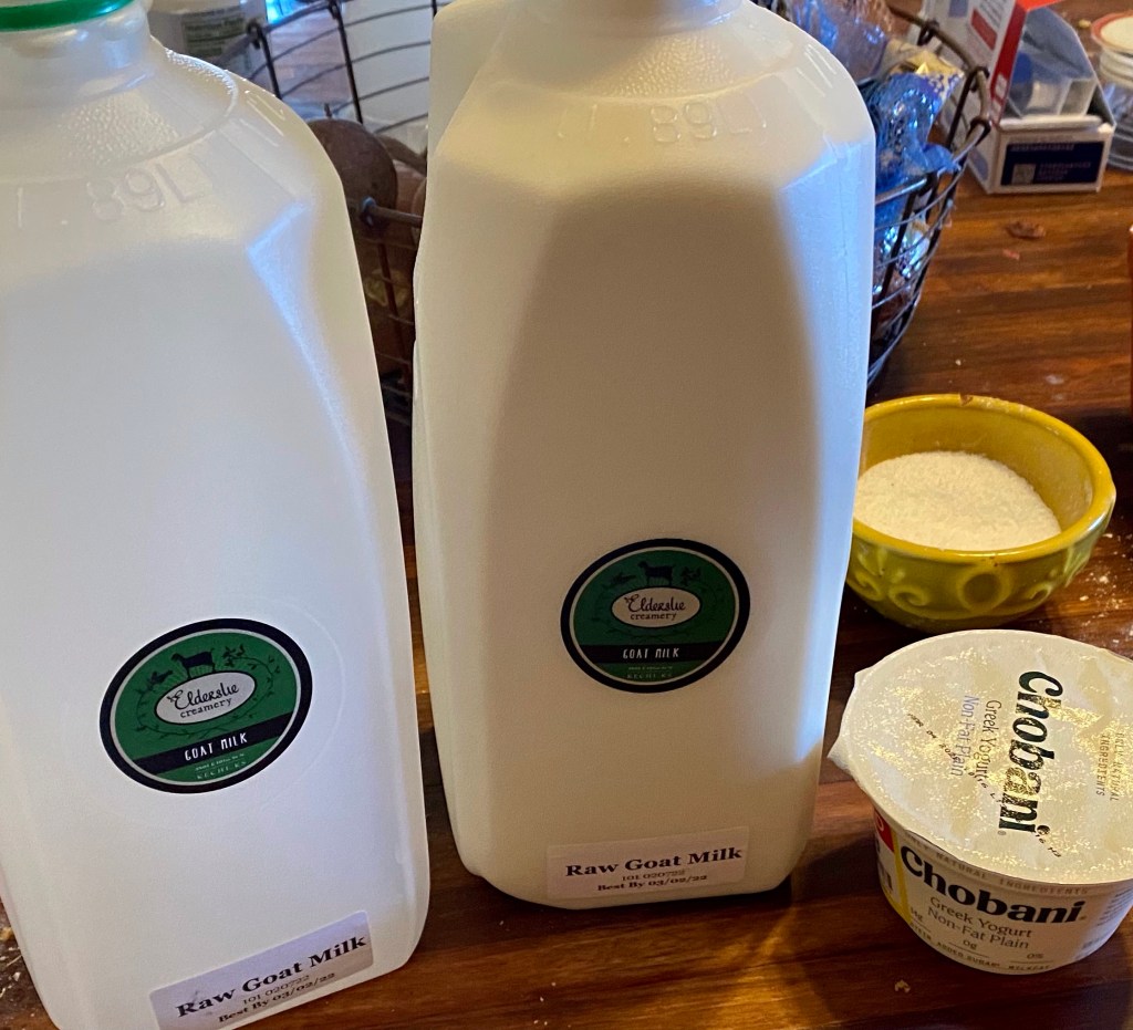 Started with about a half gallon of goat milk and a carton of plain yogurt.