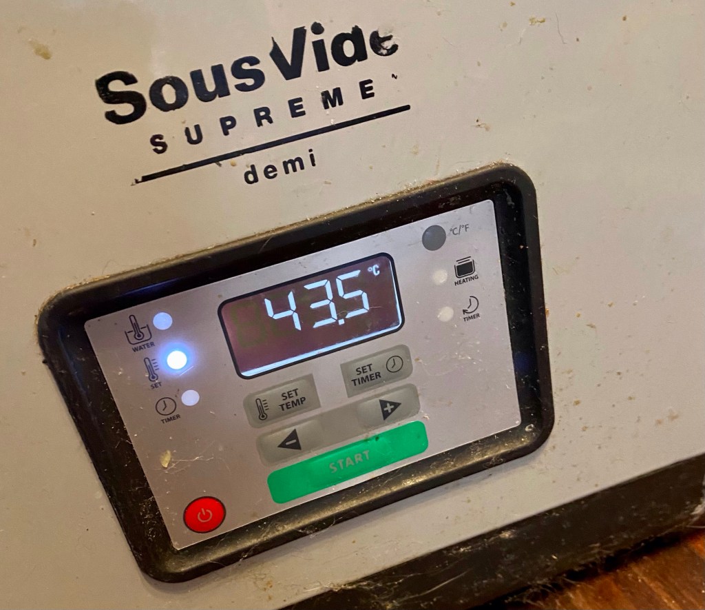 Once it cooled to about 110 degrees, I put it in half-pint jars, and closed them to finger tight. fired up the sous vide at 43.5 degrees C.