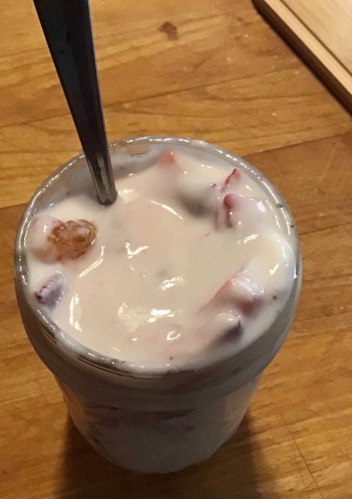 I made one with almond, vanilla, and honey yesterday. Today’s breakfast was yogurt with strawberries, peaches, and honey.