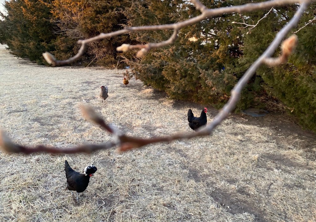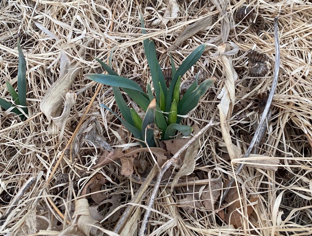 The hated callery pear is budding out, as are the apple trees. Things have a green tinge underneath the dried yellow of winter. I have bulbs ready to bloom in a few places!
