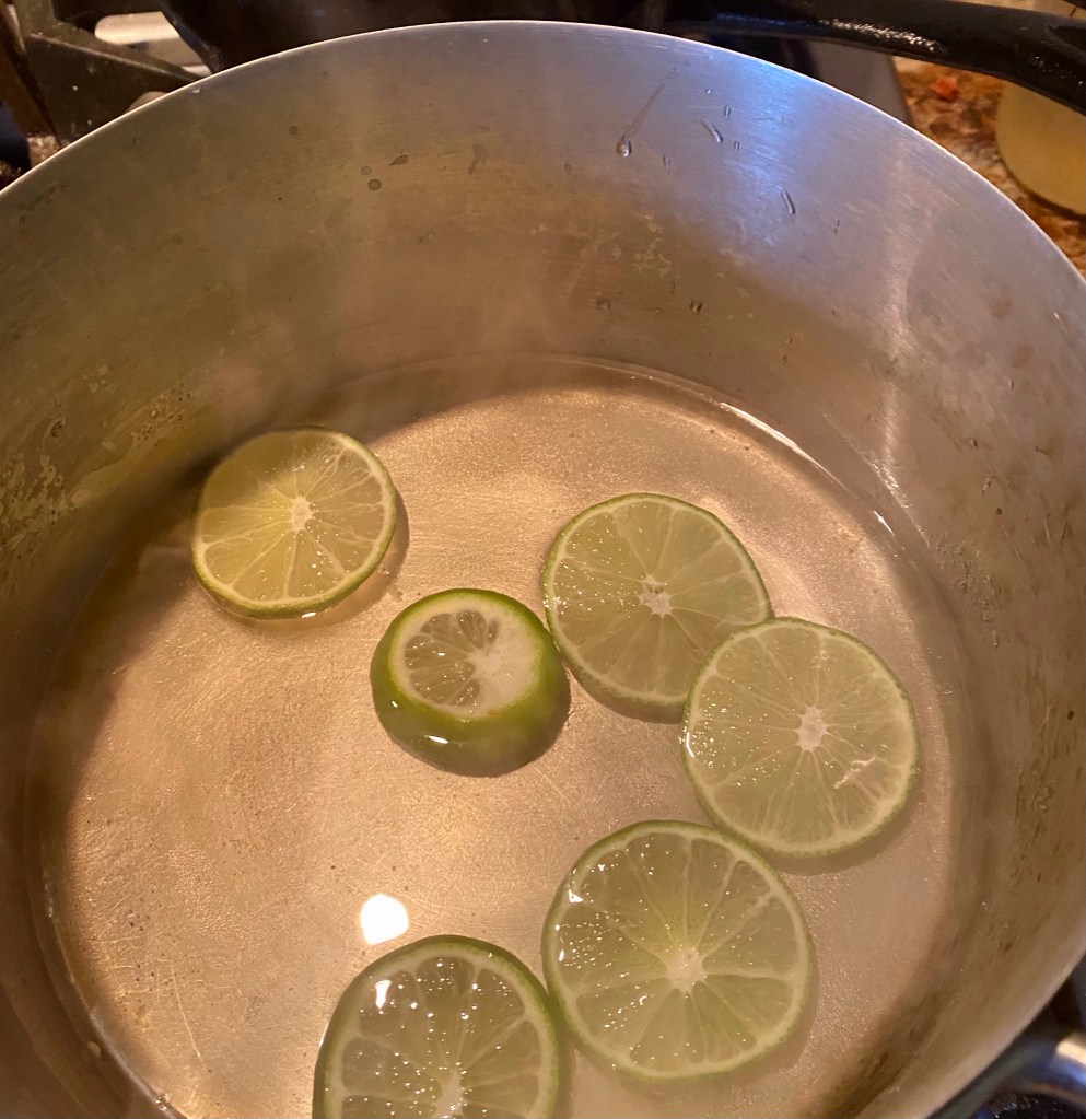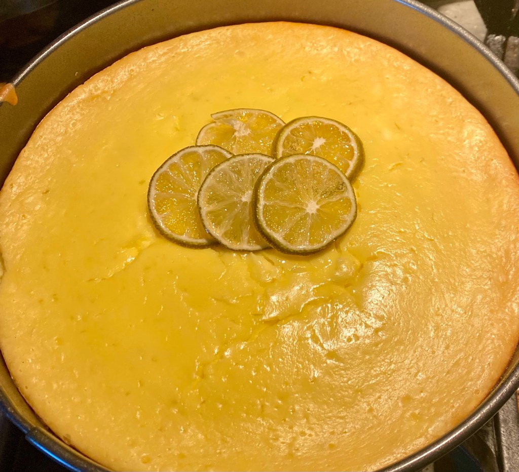 In a saucepan, dissolve 1 cup sugar into 1 cup water. Slice a lime into thin slices and place in syrup. Simmer for an hour. Dry on drying rack. place on chilled cheesecake.